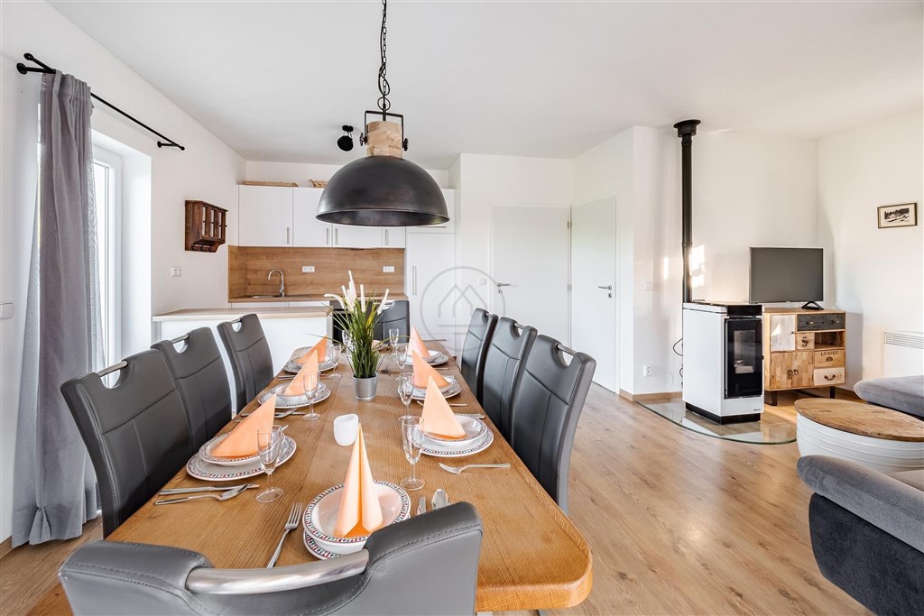 Dům s kapacitou až pro 8 osob poskytuje unikátní zázemí k rekreaci pro Vaší rodinu i budoucí klienty. Je navržen v souladu se šumavskou architekturou a důrazem na kvalitu stavebních materiálů, disponuje prostorným zádveřím, třemi ložnicemi, koupelnou se soukromou saunou, odděleným WC, technickou místností, dále velkým obývacím prostorem s kuchyní a vstupem na krytou terasu, s výhledem na Lipno a přístupem na vlastní zahradu. Součástí objektu je příplatkové vybavení, dřevěný obložený štít, kvalitní podlahy, venkovní elektrické žaluzie a peletková krbová kamna. Cena domu zahrnuje veškerý nábytek, vybavení, elektrospotřebiče a vlastní parkovací stání.