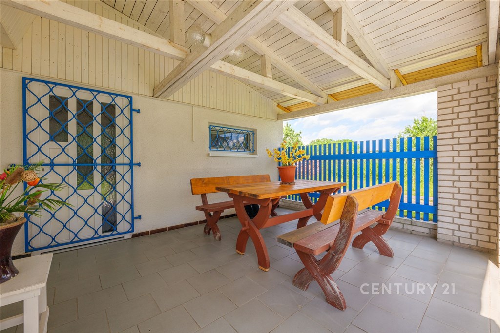 Popis chalupy: Koupelna s umyvadlem, vanou, WC, bidetem, Kuchyňský kout se sporákem, Obývací místnost s krbem pro dokonalý relax, Dřevěné schody propojují obývací pokoj s patrem, které poskytuje prostor na spaní, Garáž pro dvě auta + montážní jáma. Na zahradě je kopaná studna a pergola.