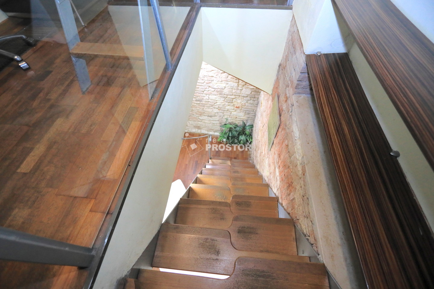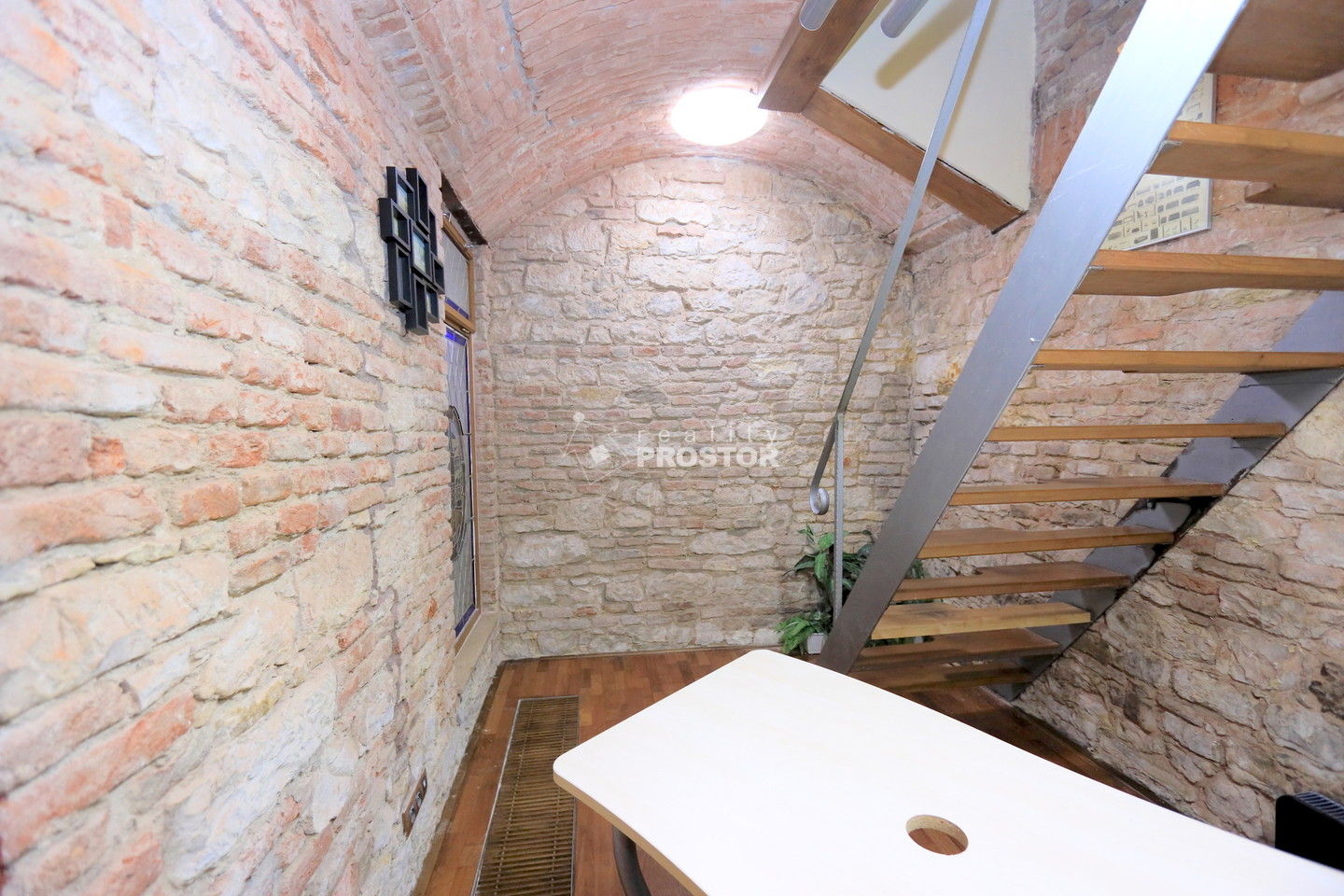 Po dřevěných schodech se schází do prostorného suterénu, který lze využít pro další pracovní místa nebo jako jednací prostor. Klíčové vlastnosti: přístup z přízemí, WC s umyvadlem, kuchyňský kout vybavený umyvadlem, varnou konvicí a mikrovlnnou troubou, zabezpečení alarmem a bezpečnostním zámkem, vchodové dveře s otvíráním na čip, videotelefon pro komunikaci s návštěvníky, vytápění zajišťují elektrické přímotopy. Tato kancelář je ideální pro firmy, které hledají dobře situované, bezpečné a funkční pracovní prostředí v pulzujícím centru Prahy.