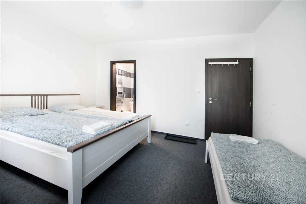 Nabízíme vám k prodeji řadový rodinný dům v Mostě Souši. Dům je po celkové rekonstrukci upravený na ubytovací zařízení. Je zateplený, má čtyři nadzemní podlaží. Výměra parcely je 279 m2, vnitřní užitná plocha je 312 m2. Nemovitost disponuje 26 lůžky. V prvním nadzemním podlaží jsou vybudovány dva apartmány (čtyřlůžkový a třílůžkový). Oba apartmány mají koupelnu a WC. V třílůžkovém apartmánu je i kuchyňská linka a má venkovní terasu s přístupem na zahradu. V druhém nadzemním podlaží jsou čtyři pokoje: dvoulůžkový, třílůžkový (tyto pokoje mají společné WC a koupelnu). Dále jsou tu dva třílůžkové pokoje s vlastní koupelnou i WC. Ve třetím nadzemním podlaží se nacházejí tři pokoje. Jeden je dvoulůžkový, zbývající dva jsou třílůžkové. Tyto pokoje mají společnou terasu. Na tomto patře je společná kuchyně a jsou tu dvě koupelny s WC. V přízemí se nachází garáž, tři místnosti, technická místnost a prádelna. Tato nemovitost má polohu na okraji Mostu, přímo naproti vjezdu do autodromu. Nedaleko je nádrž Matylda, která nabízí spoustu volnočasových aktivit, blízko je to i k mosteckému jezeru a na hrad Hněvín. Veškerá občanská vybavenost je v centru města, které je poblíž. Nemovitost je vhodná jako investice s velkým potenciálem, prodává se včetně vybavení. Zavolejte si pro další informace nebo si rovnou domluvte prohlídku. S případným financováním vám rádi pomůžeme.