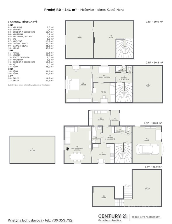 Nabízíme Vám ke koupi zděný rodinný dům 4+1 o celkové užitné ploše 341 m2 a výměrou pozemku 1120 m2 v obci Močovice u Čáslavi, okres Kutná Hora. Dům je určen k rekonstrukci, samostatně stojící, dvoupodlažní s půdním prostorem a částečně podsklepený. Zastřešení je provedeno sedlovou střechou. Pod střechou se nachází prostorná půda (3.NP). Součástí objektu je i nevytápěná garáž s menší půdou pro uskladnění věcí. Okna původní dřevěná, původní elektřina 230 - 400 V (pouze nový hlavní jistič), obecní vodovod a tlaková kanalizace, vlastní studna se třemi prameny (vydatná). Na pozemku stojí prostorná kůlna/dílna a dřevníky. Rodinný dům se nachází na velmi klidném místě, resp. na samotě u přírody. Město Čáslav se nachází pouze 2,5 km od obce Močovice a Kutná Hora cca 7 km. V obci je MŠ, obecní knihovna, obchod s potravinami, hospůdka a autobusová doprava. Na nemovitost byla podána žádost o dotaci programu z prostředků Modernizačního fondu Nová zelená úsporám, která byla již schválena s možností čerpání poskytnuté dotace. Pro více informací o schválené výši dotace sdělím na vyžádání. Dotace se vztahuje na optimální zateplení domu, tj. fasády, podlah, stropu, střechy atd., tepelné čerpadlo vzduch/vzduch nebo vzduch/voda pro vytápění a ohřev vody s podporou FV, fotovoltaické systémy pro výrobu el. energie, systém řízeného větrání se zpětným získáváním tepla a instalace dobíjecí stanice. K dispozici je i cenová nabídka na stavební práce zahrnující zateplení fasády, zateplení půdy, zateplení podlahy a výměnu oken. Objekt je bývalá staniční budova pro trať Čáslav - Močovice (4,2 km). Trať vznikla v letech 1881 až 1882 pro místní cukrovar. Zanikla částečně v roce 1965 po ukončení provozu v 60. letech. Trať sloužila primárně k dopravě cukrové řepy do cukrovaru v Močovicích, který byl v té době hlavním zdrojem nákladní dopravy na trati. V případě zájmu o prohlídku či o více informací mne neváhejte kontaktovat. Nemovitost lze financovat hypotečním úvěrem.