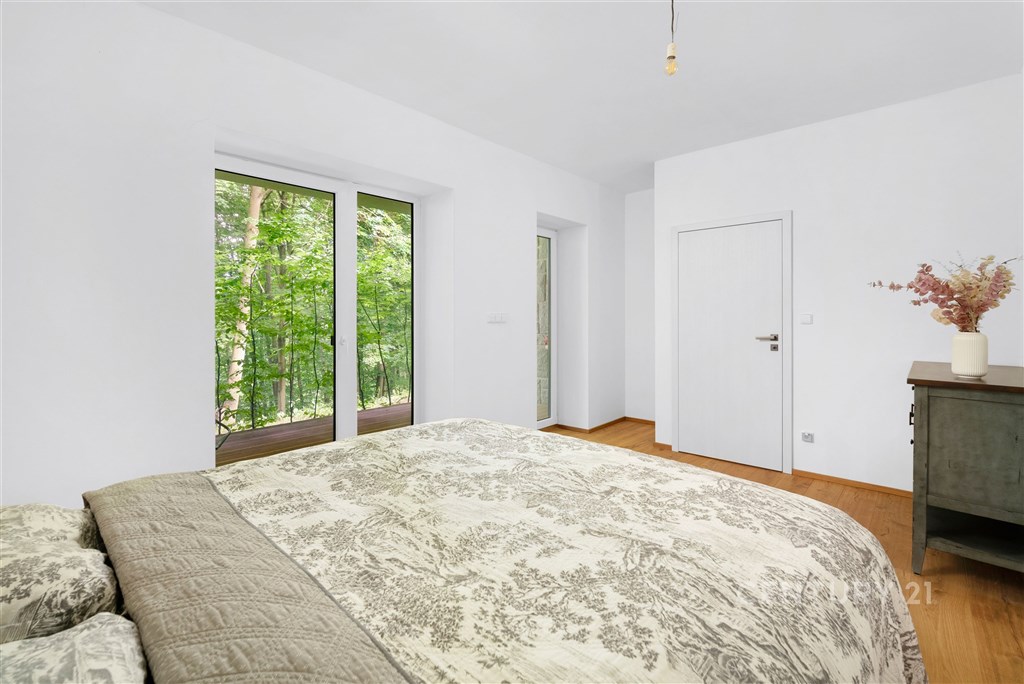 Vítám vás v tomto exkluzivním bytě 3+kk o rozloze 89 m2, ke kterému náleží tři terasy o celkové ploše přibližně 35 m2, přístupné přímo z obytných místností. Byt je umístěn v přízemí moderního domu v atraktivní lokalitě Brno - Bystrc, Jelenice. Nachází se v srdci přírody, pouhých 120 metrů od Brněnské přehrady, na okraji lesa. Propojení komfortu a přírody Každá obytná místnost má vlastní dřevěnou terasu s výhledem do zeleně, kde si můžete užívat klid, soukromí a ničím nerušený kontakt s okolní přírodou. Z ložnice je nádherný výhled na Brněnskou přehradu - v zimě otevřený, v létě chráněný svěží zelení lesa. Velká francouzská okna zajišťují dostatek denního světla a maximální propojení interiéru s exteriérem. Moderní interiér a nadstandardní vybavení Byt byl dokončen v roce 2021 s důrazem na kvalitu použitých materiálů a maximální komfort. Interiéry jsou ve stavu novostavby. Srdcem bytu je kuchyň na míru od renomované firmy Klvaňa, vybavená prémiovými spotřebiči Miele a Liebherr. Podlahy z přírodního kartáčovaného dubu jsou pouze olejované, aby vynikla jejich přirozená kresba. Obývací část zdobí originální kamenná stěna z místního přírodního kamene, která propojuje interiér s okolní krajinou. Koupelna v čistém spa stylu je vybavena sanitou Hansgrohe a Villeroy & Boch, prostorným sprchovým koutem, přípravou pro volně stojící vanu a elegantním obkladem z italského kamene. Komfortní klima a nízké náklady O tepelný komfort se stará nové tepelné čerpadlo pro celý dům, podlahové vytápění s individuální regulací v každé místnosti a energetická náročnost budovy třídy B. Dům má vlastní studnu, což zajišťuje energetickou soběstačnost a nízké provozní náklady. Bezpečnost zajišťuje kamerový systém a bezpečnostní fólie na oknech s certifikací. Součástí objektu je i útulný sklípek - po dohodě se správcem možno využívat na společenské akce. Praktické detaily a úložné prostory K bytu náleží prostorná sklepní kóje (4,7 m2) se zabezpečením dvojitým zámkem, multifunkční místnost (šatna/komora/spíž), vestavná skříň na míru a parkovací místo č. 7 přímo před hlavním vchodem do domu. V zadní části domu jsou k dispozici další parkovací stání s možností dokoupení. V domě je uzamykatelná kolárna a kontejnery na tříděný odpad. Lokalita a dostupnost Jelenice nabízí jedinečné propojení moderního bydlení a aktivního životního stylu v přírodě. Přímo za domem najdete cyklostezky, turistické trasy, plážový volejbal, možnost koupání v přehradě nebo dopravu parníkem. Zastávka Jelenice je jen pár kroků od domu - autobusová linka č. 303 vás dopraví do centra Brna každých 30 minut ve špičce. Každodenní pohodlí doplňuje dostupnost rozvozových služeb (Rohlík, Košík, restaurace). Tento byt je ideální volbou pro ty, kteří hledají moderní, komfortní a bezpečné bydlení v těsném spojení s přírodou, ale zároveň s výbornou dostupností do centra města. Tak co říkáte na tento moderní byt? Ozvěte se mi - rád vám nemovitost ukážu osobně!