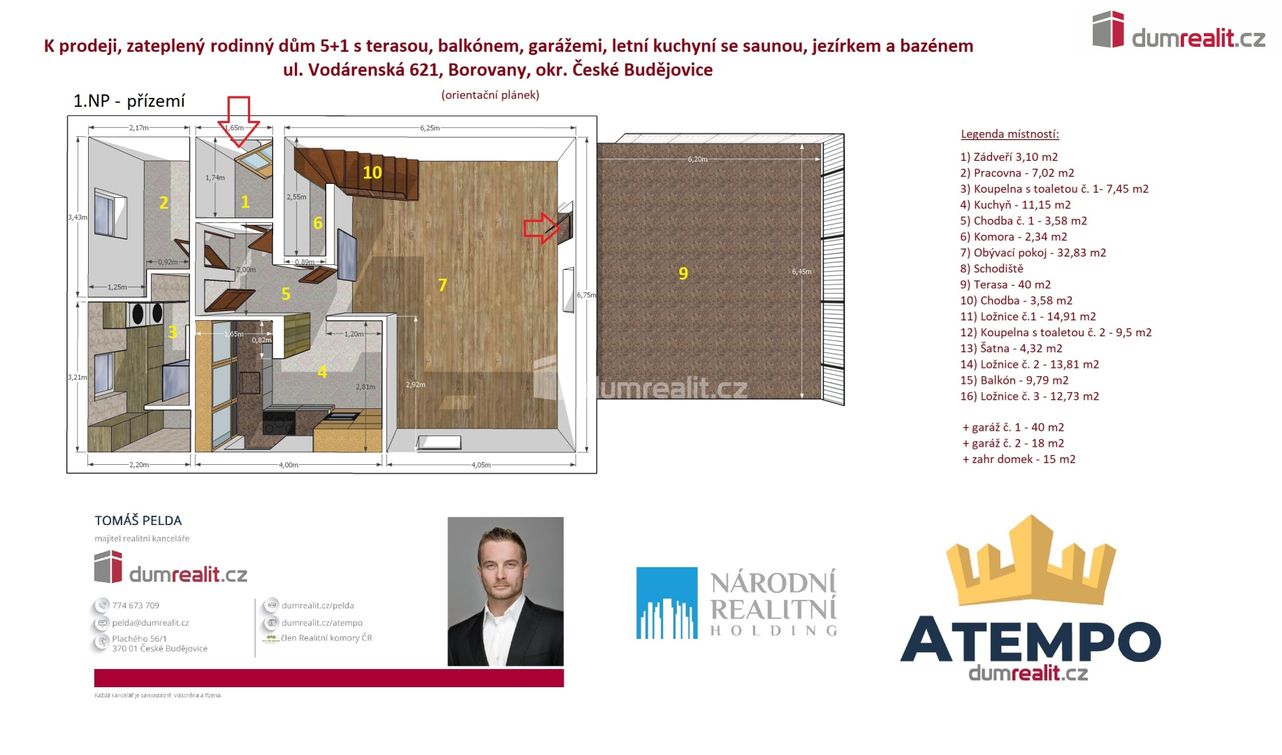 Dumrealit.cz Vám zprostředkuje prodej zděného rodinného domu 5+1 s novou kuchyňskou linkou, 2 koupelnami, pracovnou, velkou terasou, balkónem, dvěma garážemi, jezírkem, bazénem a letní kuchyní se saunou v absolutním soukromím ve městě Borovany, ul. Vodárenská č.p. 621. Prodávaný dům s pozemkem naleznete na LV č. 2068 zapsané v kú Borovany. Podrobné rozkreslení jednotlivých podlaží naleznete na orientačních pláncích mezi fotografiemi. Krásná udržovaná zahrada o výměře 1504 m2 se vzrostlým živým plotem poskytuje dostatek soukromí, prostoru pro bazén s moderním automatickým pojezdovým zastřešením a jezírko pro zachytávání dešťové vody. Na pozemku je také montovaná garáž, spojená se zahradním domkem s letní kuchyní a saunou. Objekt je připojen na plyn, elektřinu, veřejný vodovod a městskou kanalizaci. Topení a ohřev vody je plynovým kotlem. V domě se také nachází dvě klimatizační jednotky (obývací pokoj, ložnice č.1 dle orientačního plánku). Náklady na vytápění domu a ohřev vody po vyúčtování z roku 5-2024/5-2025 činí 3.500,-Kč měsíčně. Více informací Vám poskytne realitní makléř Tomáš Pelda z realitní kanceláře A TEMPO fungující pod ochrannou známkou dumrealit.cz. Zajistíme Vám financování a veškerý právní servis. Ev. číslo: 652412. Energetický štítek: G