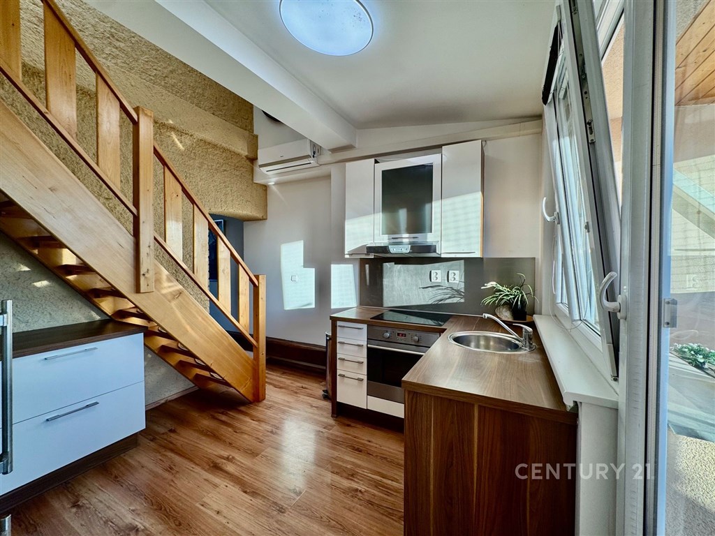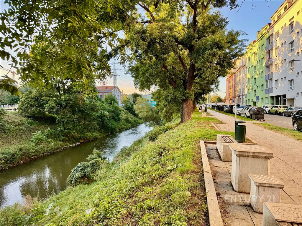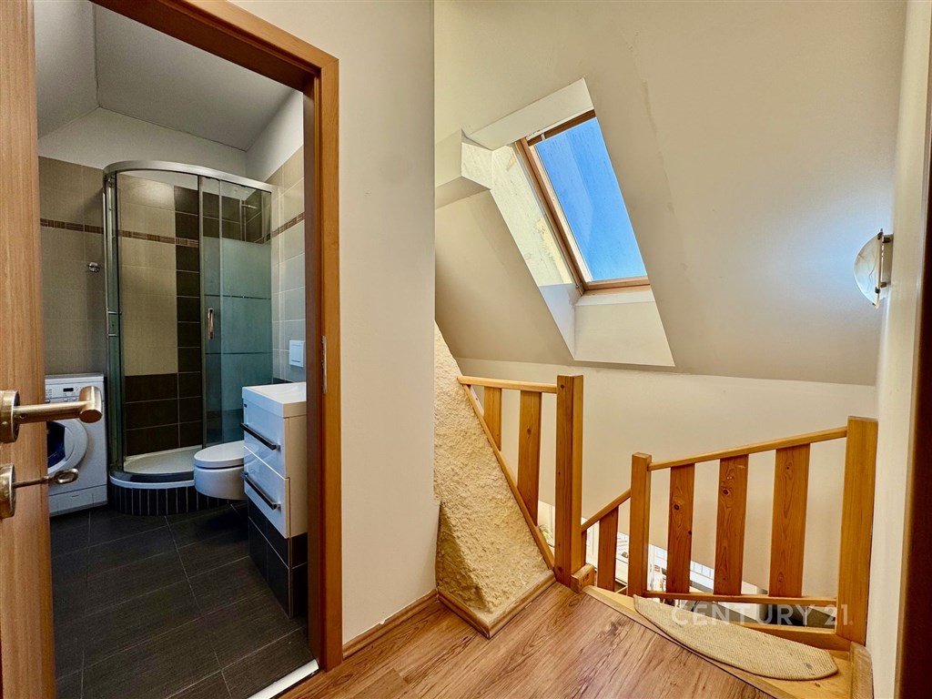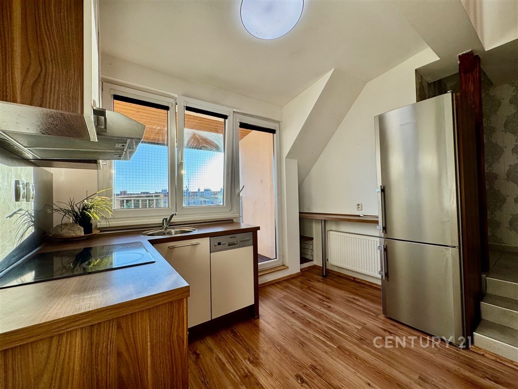 Nabízíme k prodeji moderně zrekonstruovaný byt s klimatizací o dispozici 3+kk na ulici Tržní 6 v Brně Černovicích. Tento byt se nachází v 6. patře cihlového domu bez výtahu původně z roku 1918. Dům prošel kompletní rekonstrukcí v roce 2015. Renovace střechy pak v roce 2023. Dům je zateplený s dřevěnými střešními okny. Svojí neobvyklou dispozicí a rozložením ve dvou patrech nabízí neotřelý prostor v blízkosti řeky Svitavy a dochozího Centra Brna. Interiér bytu má prvky přiznaných krovů a dominuje mu centrální stěna s prostorovou povrchovou úpravou a schodištěm do patra. Byt má přistřešenou terasu s orientací na J. Terasa směřuje do klidného vnitrobloku kam má majitel přístup. Ložnice a obývací pokoj v prvním podlaží bytu jsou orientovány na S s krásným výhledem na Židenice, Vinohrady a Líšeň. Na tomto patře je i kuchyně s terasou a toaleta s umyvadlem. Druhé patro je přístupné po dřevěném otevřeném schodišti z kuchyně. Zde je v zádveří ukrytý plynový kondenzační kotel s úložným prostorem na chodbě. Z chodby je vstup do ložnice a koupelny se sprchovým koutem, pračkou a dostatkem prostoru. Náklady měsíčně za rok 2O24 celkem 5.012 Kč: SVJ 802 Kč Elektřina 1.820 Kč Plyn 2.390 Kč Parkování je možné v modré zóně C na ul. Klíčové nebo Zvěřinové. Přímo před domem se dá bezpečně zastavit a vyložit nákup. Pro více informací a prohlídku kontaktujte makléře Petra Vyskočila.