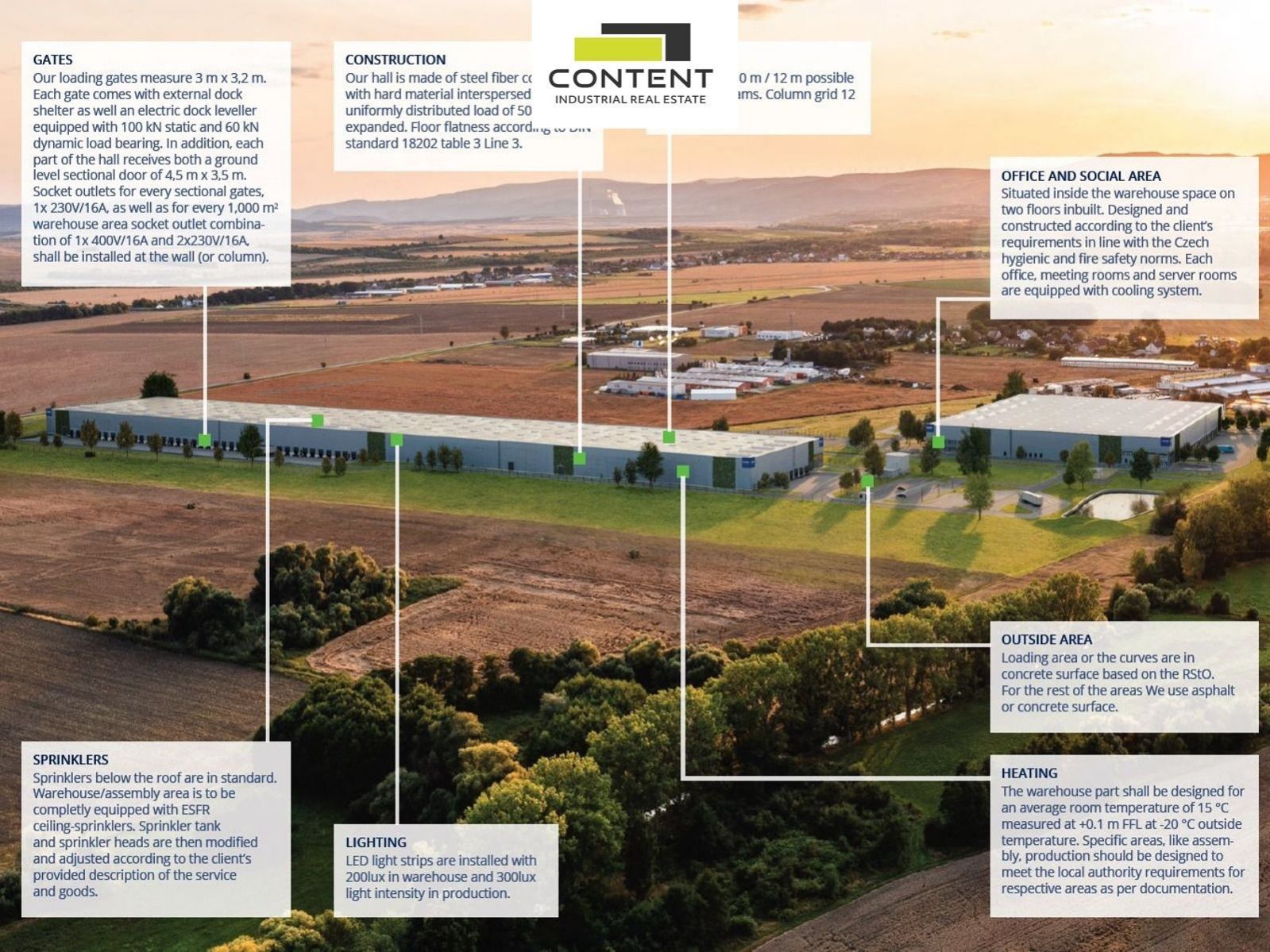 Pronájem skladu, výrobních prostor 25754 m Chomutov. V zastoupení majitele a bez provize nabízíme atraktivní novostavbu skladu nebo výrobních prostor v nově vznikajícím logistickém parku u dálnice D7, exit 75. - budova k dodání do 12 měsíců, - samostatná industriální budova lze dělit od cca 2500 m, - světlá výška 10 m, - bezprašné podlahy s nosností minimálně 5 t/m, - vstupy z hydraulických ramp i v úrovni vozovky, - sprinklery, EZS, EPS, - příjezd a manipulace TIR bezproblémová, parkování zdarma, - kancelářské prostory, vzorkovna na míru budoucího nájemce, - možnost výstavby celé budovy na míru, přesně dle požadavku zájemce (BTS) Cena bude stanovena dle dalších požadavků individuálně. Fotografie hotových budov jsou ilustrační, z již proběhlé výstavby. Pro více informací nás kontaktujte.