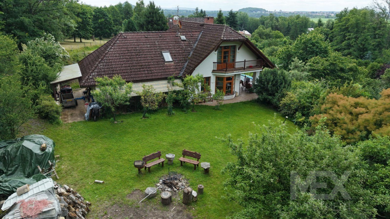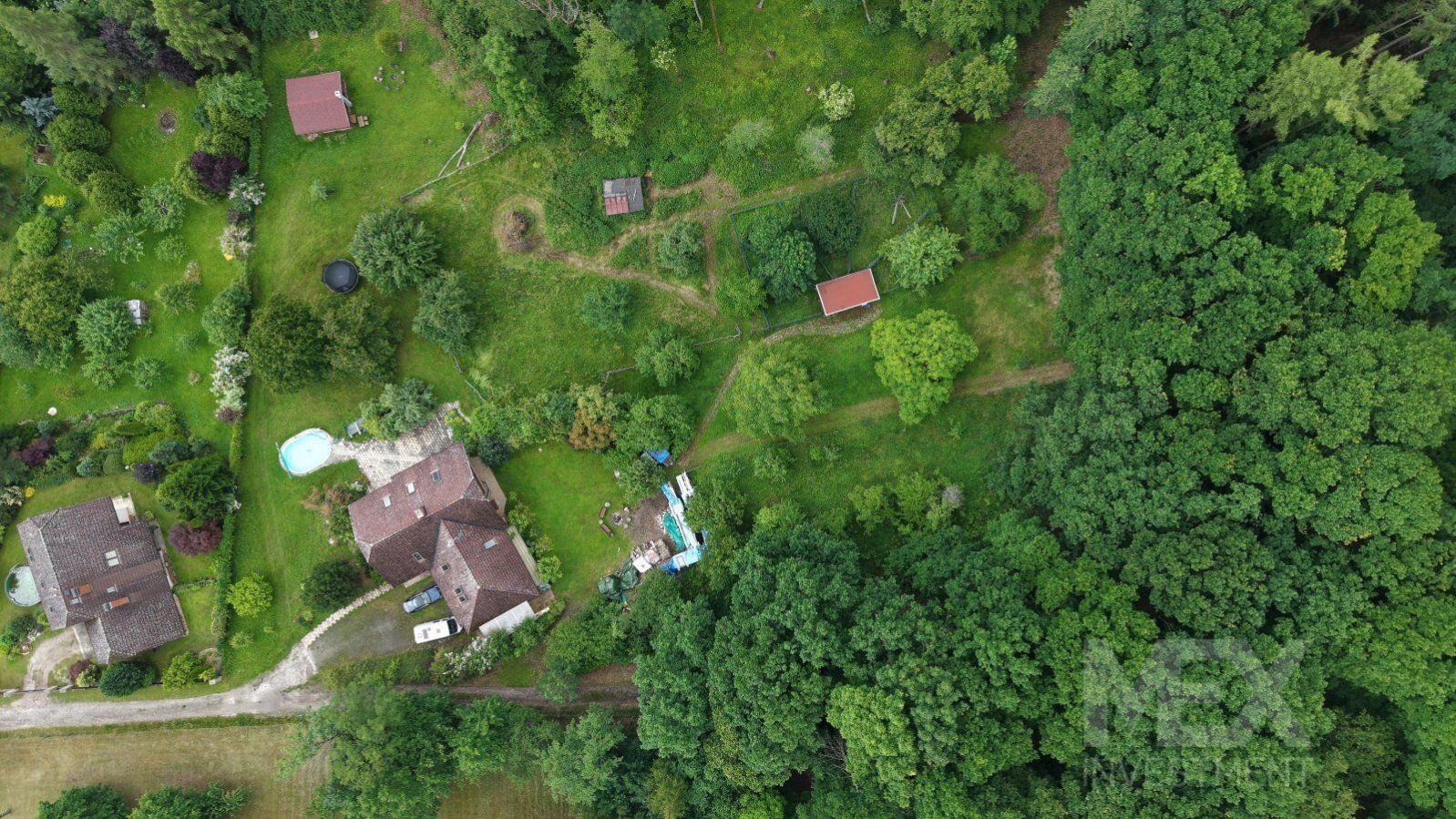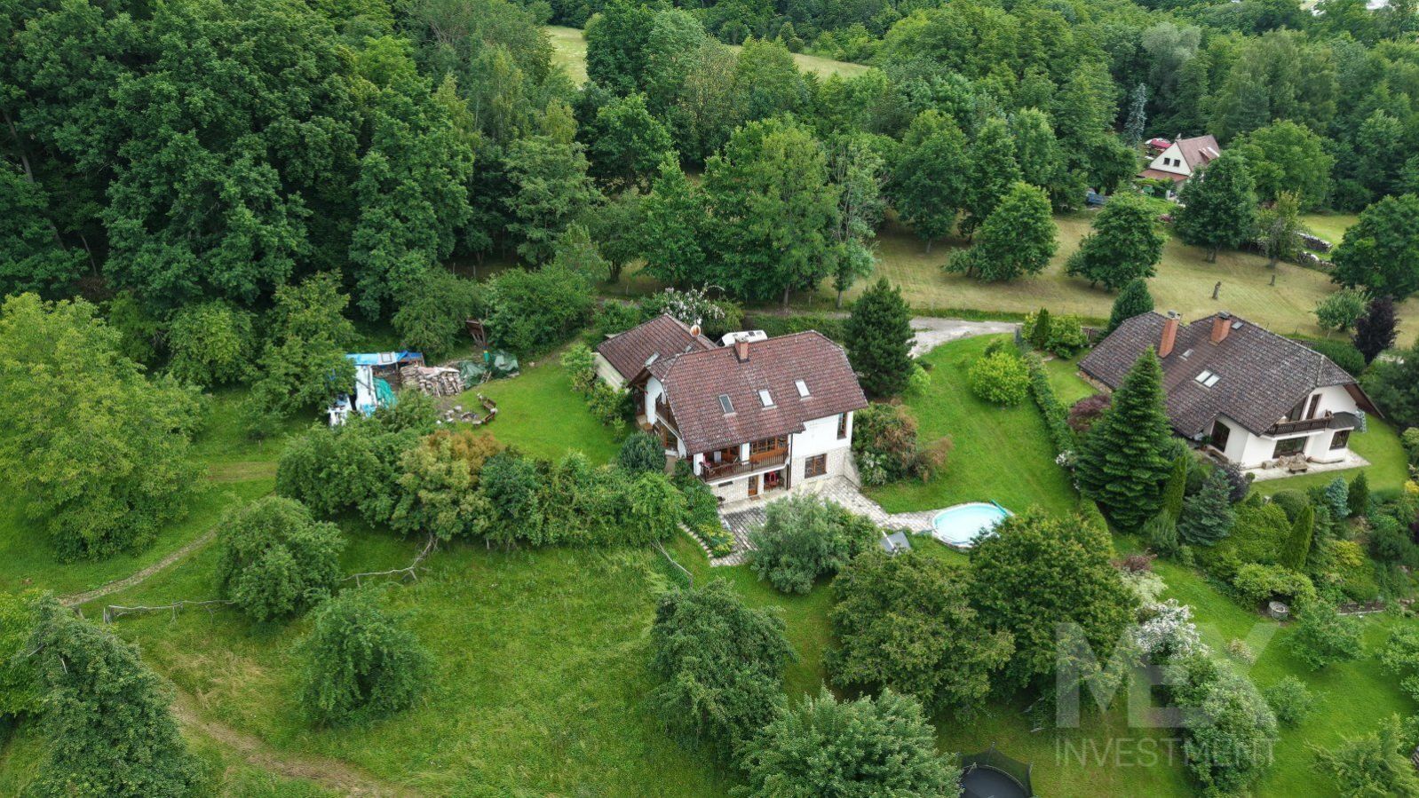 Dobrý den, představuji vám unikátní rodinný dům na krásném místě v Českém Ráji jen 3km od Jičína. - Cena bez chaty a části pozemku: 16 500 000,- Kč. Základní informace: - Užitná plocha domu: 340 m2. - Zastavěná plocha domu: 184 m2. - Zahrada: 6 480 m2. - Les: 11 808 m2. - Zastavěná plocha chatky: 35 m2. - Dům z roku 1998 (navržen architektkou Janou Galíkovou) Dispozice: - Snížené přízemí: samostatný byt 1+1 s vlastním vchodem z velké terasy. Koupelna, WC, sauna a technická místnost. S horní částí domu je propojen vnitřním i venkovním schodištěm. - Přízemí: hlavní vstup do domu, dvougaráž, spíž, kuchyň, WC, pracovna a prostorný obývací pokoj se vstupem na terasu a zahradu. - Podkroví: 3 ložnice (jedna s balkonem do zahrady), koupelna, WC a místnost pro uskladnění věcí. Technické specifikace: - Pozemek je z větší části obklopen lesem, který je součástí prodeje. - V dolní části zahrady se nachází kompletně vybavený zahradní domek/chata s dispozicí 3+1 (koupelna, WC, krbová kamna, 3 menší pokoje a kuchyňka). - Pozemek je mírně svažitý do jižně orientované zahrady. - Na zahradě je také dřevěná kůlna, kterou je možno využít k chovu zvířat nebo uskladnění nářadí. - Konstrukce domu je tvárnice Liapor. - Střešní krytina - Bramac. - Dřevěná eurookna + střešní okna Velux. - Podlaha dlažba / laminát. - Dům je napojen na elektřinu (230 / 400V). - Obecní vodovod + vlastní kopaná studnu 18 m. - Odpady jsou svedeny do ČOV (možnost napojit se na obecní kanalizaci). - Dům je vytápěn elektrokotlem s rozvodem do radiátorů. V obytném prostoru v přízemí a v koupelně v podkroví je podlahové topení. - Lze také využívat krbovou vložku Hoxter nejvyšší řady s výměníkem a napojením na radiátory i na akumulační nádrž 2m. Je připraveno i napojení na solární elektrárnu. Benefity: - Dům je poslední ve vesnici, přístupová cesta zde končí a pozemek je z větší části obklopen lesem. To znamená, že nebudete nikým rušeni. - Obrovská krásná zahrada s nádherným výhledem do okolní krajiny. - Vlastnictví kousku lesa. - Prostorná terasa s bazénem. - Spousta ovocných stromů. Pokud vás tato nabídka zaujala, neváhejte se na mě obrátit. Rád vás nemovitostí provedu a poskytnu veškeré potřebné informace. Těším se na viděnou.