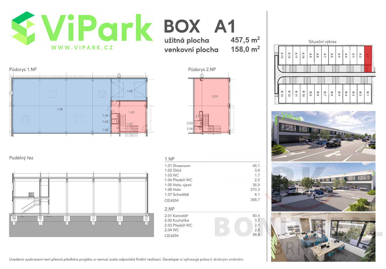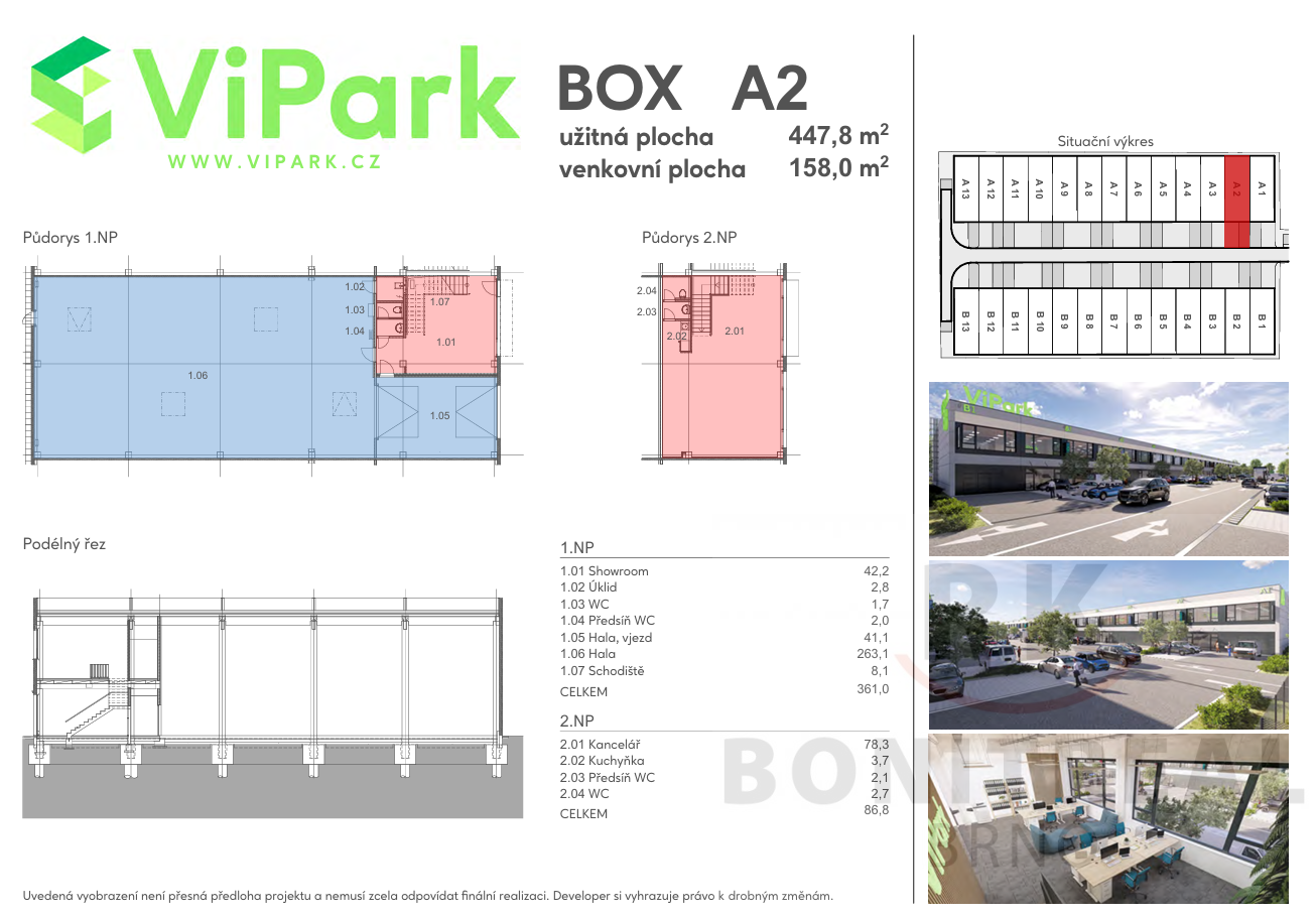 Hledáte moderní komerční prostory na skvělém místě? Nabízíme k pronájmu zcela nové boxy B2, A1 a A2 v prestižním areálu ViPark na ulici Vinohradská v Brně Černovicích. Areál se nachází v industriální zóně s perfektní dostupností jen pár minut od dálnice. Ideální pro firmy, které hledají reprezentativní zázemí pro skladování, výrobu či jiné podnikání. Příjezd kamionu je možný přímo k hale. Box disponuje: showroomem v 1.NP (42 m2), halou i s vjezdem (304 m2), kancelářskými prostory v 2.NP (78 m2), sociální zázemí v obou patrech, technickou místností přímo v hale, 5-7 vlastními parkovacími místy - 158 m2 celková venkovní plocha (rozměry jednotlivých boxů jsou maličko odlišné). Kolaudace prostor proběhla v červenci 2025. Podmínky pronájmu: Box B2, 447,8 m2: - nájemné: 107.000 Kč/měsíc + DPH, + služby 5.000 Kč/měsíc + energie (elektřina, plyn, voda): platba zálohově, pravidelné vyúčtování; vratná kauce: 1x měsíční nájemné. Box A1, 457,5 m2: - nájemné: 114.000 Kč/měsíc + DPH, + služby 5.000 Kč/měsíc + energie (elektřina, plyn, voda): platba zálohově, pravidelné vyúčtování. Box A2, 447,8 m2: - nájemné: 110.000 Kč/měsíc + DPH, + služby 5.000 Kč/měsíc + energie (elektřina, plyn, voda): platba zálohově, pravidelné vyúčtování. Výhody, které oceníte jsou: neplatíte provizi RK, úplně nové prostory připravené k nastěhování od prosince 2025, strategická poloha v Brně Černovicích na ulici Vinohradská - rychlé napojení na dálnici, MHD zastávka přímo před areálem, moderní areál s reprezentativním vzhledem, férové podmínky pronájmu bez zbytečných poplatků, PENB - klasifikační třída B - Velmi úsporná stavba - nízké provozní náklady. Boxy pronajímáme samostatně každý zvlášť, avšak pokud byste měli zájem o pronájem dvou nebo více boxů vedle sebe, kontaktujte mne ohledně dostupnosti a možností. Prostory vám velmi ráda osobně ukážu na prohlídce. V případě dalších dotazů mi neváhejte zavolat.