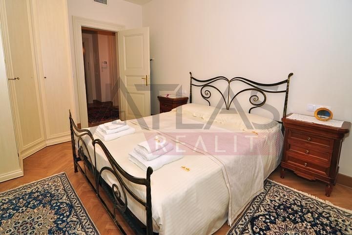 Pronájem kompletně zařízeného bytu 3+kk, 96 m2 v 1. patře s výtahem v prestižním klasickém secesním domě s vysokými stropy a originální výzdobou po kompletní rekonstrukci, která proběhla v roce 2006. Dům se nachází v residenční oblasti historického centra Prahy, jen 200 m od parku Riegrovy sady, 300 m od stanice metra trasy A Náměstí Míru a 500 m od Václavského náměstí stanice metra Muzeum trasy A a C a nákupního a kulturního centra Prahy. Byt je kompletně zařízen pseudostarožitným italským nábytkem. Obývací pokoj 45 m2, s kuchyňským koutem vybaveným lednicí s mrazákem, myčkou, plynovým sporákem, digestoří, dále dvě ložnice 16 m2 a 16 m2, koupelna s umyvadlem, rohovou vanou, WC a bidetem. Byt má telefonní linku, rychlý internet, TV, satelit, na podlahách parkety a dlažba, při rekonstrukci byly použity nadstandardní materiály. V domě jsou vybudovány podzemní garáže, výtah, na dvoře domu je velký bazén 8 x 11 m hluboký 1,2 metru s hydromasážním koutem, obklopený terasou a zelení. V domě je také kamerový systém, ostraha, správce a používání bazénu v ceně. Možnost pronájmu garáže.