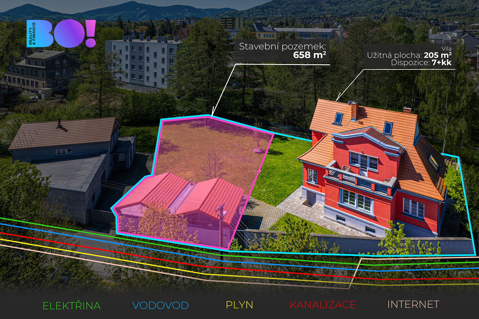 Nabízíme Vám k prodeji exkluzivní rodinný dům se stavebním pozemkem v srdci Frýdlantu nad Ostravicí na ulici Emila Pajurka. Dům se nachází v samém centru města a svou prostornou dispozicí 7+kk s užitnou plochou 205,38 m2 a se stavebním pozemkem nabízí velkorysé prostory pro pohodlné a klidné bydlení. Možné využití: - bydlení pro vícegenerační rodinu - sídlo firmy či podnikání spojené s bydlením - vybudování ordinací Dispoziční řešení prvního podlaží (104,26 m2): vstupní hala, samostatné wc, kouzelný otevřený prostor, kde se snoubí elegantní kuchyně s ostrůvkem, útulná jídelna a prostorný obývací pokoj s krbem - ideální místo pro společné chvíle s rodinou i přáteli. Ke komfortu přispívají dva světlé pokoje s koupelnou a odděleným WC. Tady se budete cítit opravdu jako doma! Druhé podlaží (101,12 m2): Vstupní hala vás zavede do světlého pokoje s nádhernou terasou, odkud si můžete vychutnat relaxaci a úchvatný výhled na Lysou horu. Dále se zde nachází ložnice se šatnou, koupelna s vanou a samostatné WC. K útulné atmosféře přispívá také prostorný a prosvětlený kout se vstupem do podkroví. Třetí podlaží: V podkrovním prostoru si můžete vytvořit klidnou ložnici, inspirativní pracovnu, dětskou zábavnou hernu nebo relaxační místnost, kde si vychutnáte chvíle odpočinku. Díky své variabilitě se podkroví snadno přizpůsobí vašim potřebám. Sklep o rozloze 87,30 m2 nabízí mimořádné možnosti využití. Je zde umístěna sauna, vana na ochlazení a prostor, který lze přeměnit například na domácí posilovnu, vinotéku nebo skladovací místnost. Sklepní prostory poskytují flexibilitu pro další úpravy podle přání nového majitele. Dům se nachází na pozemku o celkové rozloze 1349 m2 včetně stavebního pozemku. Plocha nabízí dostatek prostoru pro odpočinek i aktivní vyžití. Můžete si zde vytvořit krásnou zahradu, vybudovat venkovní posezení, užívat si chvíle pohody pod pergolou nebo si s dětmi hrát na čerstvém vzduchu. Pozemek zároveň poskytuje možnost vybudování bazénu či menšího hřiště, které ještě více podtrhne jedinečnou atmosféru tohoto místa. Je to ideální místo, kde si můžete vychutnat klidné prostředí, a přitom zůstat v dosahu všech služeb a občanské vybavenosti města. Díky této přidané hodnotě se jedná o velmi lukrativní nabídku, která nejen zvyšuje potenciál využití, ale také výrazně zhodnocuje celkovou hodnotu nemovitosti. Neváhejte a využijte tuto jedinečnou příležitost vlastnit tuto nemovitost v prestižní lokalitě centra města. BO! spolu tvoříme příběhy..