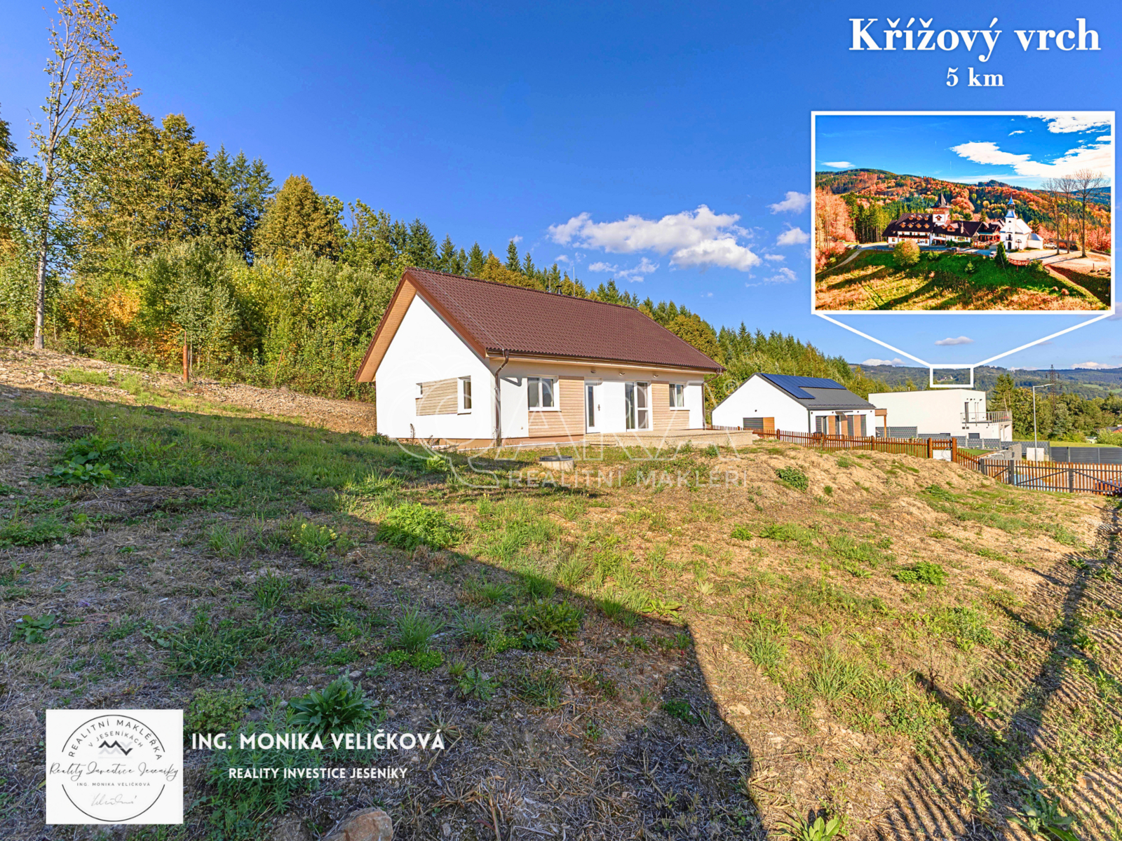 K prodeji nabízím novostavbu samostatně stojícího rodinného domu typu bungalov 4+kk s užitnou plochou 93 m2. Dům byl zkolaudován v roce 2024 a nachází se v Jeseníku na ulici Modřínová, v klidné lokalitě s výjimečným výhledem na okolní hory. Díky kompletnímu dokončení je připraven k okamžitému nastěhování bez dalších úprav či investic. Pozemek má výměru 1 111 m2, z toho zastavěná plocha a nádvoří 114 m2. Dům je situován při okraji parcely, aby zahrada nabídla dostatek prostoru a terasa poskytla otevřený výhled na Jeseníky. Pro zájemce je navíc k dispozici zpracovaný projekt zahrady, který může sloužit jako inspirace nebo okamžitý podklad pro realizaci venkovního prostoru. Významným bonusem je také možnost využití půdy, která je pochozí a umožňuje vybudování další obytné místnosti. Stavba je realizována jako zateplená dřevostavba v difuzně uzavřeném systému. Součástí vybavení je tepelné čerpadlo pro vytápění i ohřev vody, příprava na solární ohřev, podlahové vytápění s regulací v každé místnosti, krb, plastová okna s trojsklem a sítěmi proti hmyzu, betonová střešní taška, retenční nádrž na dešťovou vodu, vinylové podlahy a zabezpečovací systém Jablotron. Provozní náklady se pohybují okolo 4 000 Kč měsíčně včetně elektřiny a vody. Dispozičně dům nabízí obývací pokoj s kuchyňským koutem a vestavěnými spotřebiči s přímým vstupem na terasu, tři samostatné ložnice, koupelnu se sprchovým koutem a WC, samostatné WC a technickou místnost se sprchovým koutem a technickým zázemím. Prostorná vstupní chodba umožňuje instalaci vestavěné skříně nebo vybudování schodiště do podkroví. Novostavba, úsporný provoz, atraktivní lokalita s výhledem, možnost okamžitého nastěhování a hotový projekt zahrady - to jsou hlavní charakteristiky této nemovitosti. Dům není zatížen žádnou hypotékou. V případě zájmu o prohlídku mě prosím kontaktujte. Ráda vám poskytnu veškeré informace a zajistím kompletní realitní a právní servis včetně pomoci s financováním. Průkaz energetické náročnosti budovy: 135 kWh/m2/rok.