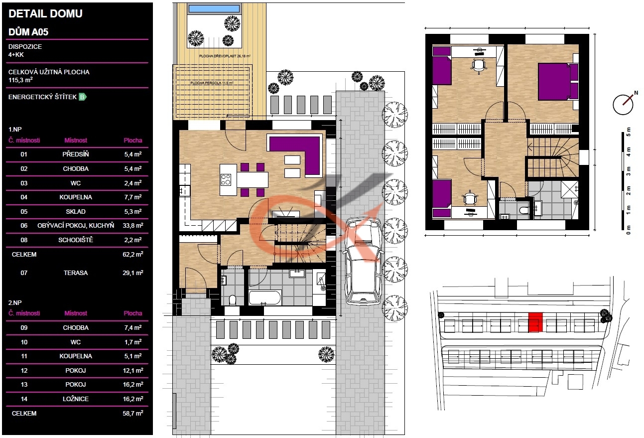 Prodej řadového rodinného domu o zastavěné ploše 84m2 s pozemkem včetně zastavěné plochy 195m2, RD 05. Jedná se o dvoupodlažní skeletový dům o dispozici 4+kk , celková užitná plocha 116,3m2. Dům je situován na ulici Holešovská v nově vznikající lokalitě. V první fázi bude postaveno jedenáct rodinným domů, následně výstavba dalších šesti domů. V přízemí domu se nachází vstupní chodba, centrální chodba se schodištěm do patra domu, koupelna s vanou, samostatná toaleta, obývací pokoj propojený s kuchyní o výměře 34,8m2, z obývacího pokoje je vstup na venkovní terasu, pod schodištěm je komora. V patře domu jsou tři prostorné pokoje, dva o velikosti 16m2 a jeden 12m2, koupelna se sprchovým koutem, samostatná toaleta, prostorná chodba. V domě bude elektrické podlahové vytápění, příprava pro instalaci krbových kamen a vývod pro externí komín. Střešní krytina - plechové šablony, okna plastová trojskla, podlahy linoleum, vnitřní dveře včetně obložek, bojler pro ohřev teplé vody, koupelny budou vybaveny obklady, dlažbou a veškerou sanitou. Příjezd k domu bude řešen zámkovou dlažbou, což umožní vznik parkovacích stání podél domu. Dům bude napojen na veřejný vodovodní řád a kanalizaci, přístup bude zajištěn z obecní komunikace. Dům se nachází přibližně 900m od centra Fryštáku a 8 km (cca 15 minut autem) od Zlína. Dům je ve výstavbě, jeho dokončení je plánováno v prvním kvartálu roku 2026.