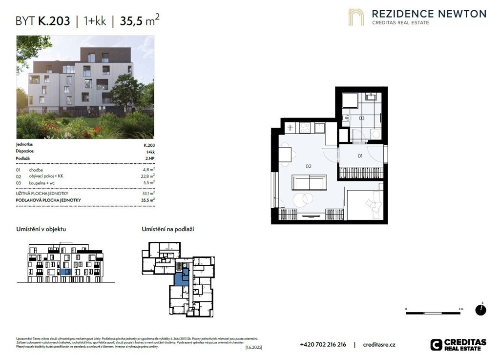 Dovolujeme si vám nabídnout byt 1+kk o celkové výměře 36 m2, umístěný v 2. NP, který je součástí projektu Rezidence Newton v pražských Kobylisích. Rezidence Newton přináší moderní bydlení v komorním projektu s pouhými 35 byty, zasazeném do klidného vnitrobloku se vzrostlou zelení, jen pár kroků od Kobyliského náměstí a stanice metra C. Projekt spojuje soukromí s výhodami městského života - perfektní dostupnost, kompletní občanská vybavenost i rychlé spojení do centra Prahy. Byty jsou navrženy s důrazem na komfort a funkčnost. Vybrané jednotky disponují velkorysými předzahrádkami, lodžiemi či terasami s panoramatickými výhledy na Prahu, zatímco jiné ocení praktičnost dispozic nebo klidnou orientaci do vnitrobloku. V prvním podzemním podlaží se nachází parkovací stání a sklepy. Cena garážového stání začíná na 600 000 Kč vč. DPH, cena sklepu pak od 129 000 Kč vč. DPH. Plánované dokončení projektu: 1.Q 2028. V případě zájmu nás neváhejte kontaktovat. Prodej probíhá přímo od majitele. Více informací o tomto bytu a kompletní nabídce najdete na webu CREDITAS Real Estate.