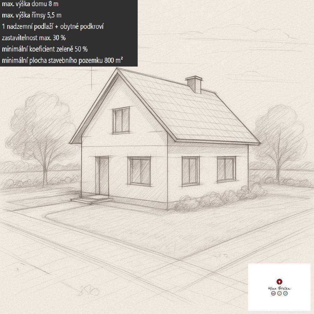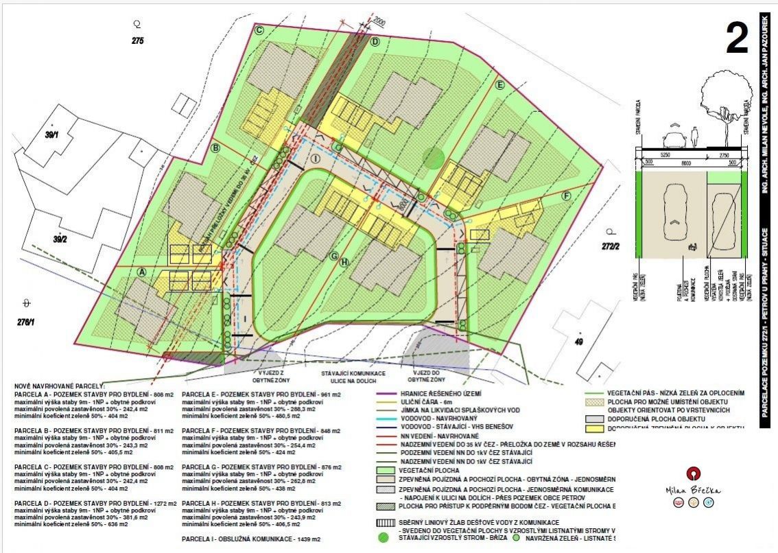 Nabízíme k prodeji pozemek určený pro výstavbu osmi rodinných domů, na které byla zpracována územní studie, u které byla odsouhlasena odborem územního plánování v Černošicích. Tento pozemek představuje příležitost pro investory a developery, kteří hledají lokalitu s potenciálem pro výstavbu rodinných domů o třech bytových jednotkách v malebné části Bohulib. Celkem rozloha 8.636m2 Komunikace: 1.439m2 Stavební pozemky: 7.197m2 Na pozemku je možné realizovat výstavbu maximálně jednoho nadzemního podlaží a podkroví, přičemž objekty mohou být podsklepené. Důraz je kladen na vhodné začlenění do kompozice místní části, což zaručuje harmonické soužití s okolními stavbami a přírodou. Podmínkou výstavby v ploše Z1-3 je také minimalizace terénních úprav a zpevněných ploch mimo komunikace, což přispívá k ochraně životního prostředí a zachování přírodního rázu krajiny. Maximální počet rodinných domů, které mohou být na pozemku postaveny, je stanoven na 8. Tento limit byl určen s ohledem na sociální začlenění nových obyvatel a zajištění kvalitního bydlení pro všechny. Pozemek tedy nabízí možnost vytvoření příjemného a klidného bydlení pro rodiny, které hledají harmonické prostředí s dobrou dostupností služeb a přírody. Kompletní dokumentace k dispozici Územní studie Bohuliby Východ Z13 Hydrogeologický posudek Dendrologický posudek Výkresy parcelace Dopravní řešení Situační výkresy   Regulativy výstavby podle územní studie max. výška domu 8 m max. výška římsy 5,5 m 1 nadzemní podlaží + obytné podkroví zastavitelnost max. 30 % minimální koeficient zeleně 50 % minimální plocha stavebního pozemku 800 m doporučená tradiční venkovská architektura s přírodními materiály   V územním plánu obce Petrov u Prahy je odpovědnost za vybudování komunikací obvykle přidělena obci, zejména pokud se jedná o veřejně prospěšné stavby. Tato odpovědnost je často specifikována v části územního plánu věnované veřejně prospěšným stavbám. Například v dokumentu Úplné znění ÚP Petrova po vydání změny č.1 jsou uvedeny výkresy a textové části, které detailně popisují plánované komunikace a jejich investory.