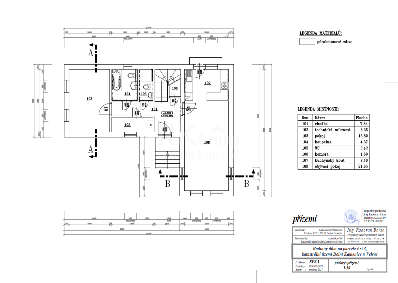 Nabízíme prodej novostavby RD 130 m2 na pozemku 458 m2 v obci Dolní Kamenice u Velvar, okr. Kladno. Jedná se o nepodsklepený rodinný dům s podkrovím, kolaudace 11/2025. V přízemí obývací pokoj s prostorem připraveným na instalaci kuchyňské linky, ložnice, dvě koupelny s WC (jedna s vanou, druhá se sprchou), komora a technická místnost s kotlem zn. Buderus zajišťujícím vytápění a ohřev TUV. V podkroví jsou dva větší pokoje. Dům je napojen na všechny inženýrské sítě, vč. obecní kanalizace. Zdivo Porfix P2-440, železobetonové stropy, sedlová střecha, tašková krytina. Okna plastová, v podkroví střešní okna. Podlahy laminátové + dlažba, schodiště betonové, schodnice z bukového masivu, nerez zábradlí. Příprava pro TV a internet - rozvody v celém domě, instalováno zabezpečovací zařízení. Provedeny terénní úpravy, vč. založení trávníku. Na pozemku jedno parkovací místo. Dolní Kamenice u Velvar je klidná část obce, v nedalekých Velvarech se nachází veškerá občanská vybavenost. Blízkost D8 zaručuje výbornou dopravní dostupnost Prahy. V případě financování hypotékou Vám zdarma pomůžeme vybrat tu nejvýhodnější variantu. Pro více informací kontaktujte makléře.
