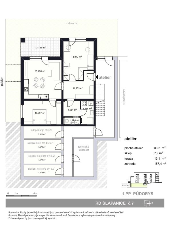 V rámci projektu Nové Šlapanice, který vyrůstá na okraji města Šlapanic si Vám dovolujeme představit výjimečné a na danou lokalitu ojedinělé bydlení. Představujeme Vám 3.etapu, která je zaměřena na výstavbu 4 viladomů, se 3 bytovými jednotkami a ateliérem. Je to ideální místo pro ty, kteří hledají kvalitní, moderní, prostorné a dispozičně chytře řešené bydlení. V tomto projektu nabízíme k prodeji ateliér 3+KK s terasou 13,12m2 a zahradou 157,4m2, sklepem 7,9m2 a 1 parkovacím stáním, vše je součástí kupní ceny. Možnost dokoupení dalšího parkovacího stání za cenu 300.000,-Kč. První tři kupující v tomto projektu mají BONUS - KUCHYŃSKOU LINKU VČETNĚ VŠECH SPOTŘEBIČŮ Zn. ELECTROLUX V HODNOTĚ 650.00,-Kč ZDARMA. V celém bytě jsou venkovní žaluzie. Viladům č.7 na ulici Stanislava Hanzela Byt č.3 o celkové ploše je umístěn v 1.PP Dispozice: chodba 11,25m2, obývací pokoj s kuchyňským koutem 25,75m2, ložnice 18,91m2, dětský pokoj 15,39m2, koupelna se sprchovým koutem včetně WC 6,75m2, technická místnost 5,01m2. Z obývacího pokoje přes terasu o výměře 13,12m2 na zahradu 157,4m2. Standarty bytu, které jsou součástí kupní ceny: - podlahy vinyl, keramická dlažba - koupelna - sanitární technika, 1x umyvadlo včetně baterie, sprchový kout včetně WC, zrcadla, obklady - mramor - interiérové dveře + obložkové zárubně, vstupní dveře - podlahové vytápění, topné těleso - venkovní světla - rekuperace Samotná lokalita nabízí širokou škálu pracovních možností a veškerou potřebnou občanskou vybavenost a výbornou dojezdnost díky dálnici D1 a D2. Také zde v docházkové vzdálenosti nalezneme školu, školku, řadu obchodů, restaurací a služeb, trolejbusovou zastávku, ale především vlakové nádraží, z kterého jste na Hlavním vlakovém nádraží v Brně va 15 min. Dokončení bytů je plánované na 3Q roku 2026. Výhodou je model financování nemovitosti. Pokud by Vás nabídka tohoto či jakéhokoliv jiného bytu v tomto projektu zaujala, kontaktujte prosím makléře, u kterého se dozvíte více. Děláme moderní bydlení dostupnější.