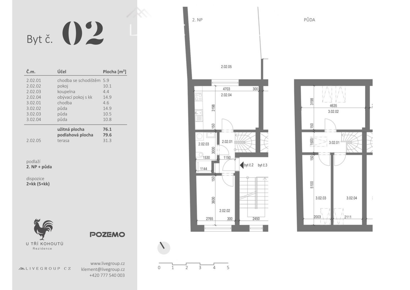 Nová rezidence U tří kohoutů v Ivančicích nabízí 5 nových bytových jednotek. Projekt U tří kohoutů nabízí stylový byt č. 2 - 5+kk o ploše 79,6 m. Nachází se v centru Ivančic u Brna a nabízí moderní bydlení v příjemném prostředí. Největším benefitem je prostorný obytný prostor s kuchyňským koutem a přímým vstupem na sever orientovanou terasu o velikosti 31,3 m, která poskytuje ideální místo k relaxaci. Dispozici dále tvoří vstupní chodba s místem pro úložné prvky, ložnice a koupelna se sprchovým koutem. Komfort doplňuje skladovací kóje a možnost krytého venkovního parkování ve vnitrobloku v hodnotě 400.000,- Kč. Projekt U tří kohoutů představuje nový standard bydlení. Spojuje moderní architekturu a špičkové technologie s důrazem na udržitelnost. Nabízí širokou škálu bytů od 2+kk, 4+kk až po prostorné 5+kk s balkónem, terasou nebo zahrádkou. Moderní technologie zahrnují retenční nádrže, multisplitové jednotky (tepelná čerpadla) a přípravu pro instalaci fotovoltaických panelů, které dohromady zajišťují energetickou úspornost a zvyšují komfort bydlení. Rezidence U tří kohoutů je vhodná pro všechny generace. Vnitroblok je obklopen zelení, v blízkém okolí s dětskými hřišti, sportovišti a cyklostezkou. Okolní prostředí láká k aktivnímu odpočinku aktivitami v těsné blízkosti komplexu. Veškerá občanská vybavenost poskytuje potřebné služby, což činí z rezidence ideální místo pro moderní život. Byt bude dokončen ve vysokém standardu, jakou jsou vinylové podlahy, velkoformátové obklady, vybavení koupelen značky Laufen a Hansgrohe, bezpečnostní vstupní dveře nebo plastová okna s izolačními trojskly venkovními žaluziemi na elektrické ovládání. Podlahové elektrické vytápění a chlazení udržují ideální teplotu v každé místnosti po celý rok. U bytu č. 1 a 2 bude rekuperace, která zajišťuje kontrolované větrání a přívod čerstvého vzduchu. Ivančice je klidné a malebné město, které skvěle kombinuje blízkost k přírodě s městskou vybaveností. Je známé svými historickými památkami i rozsáhlými přírodními oblastmi, včetně přírodního parku Bobrava a Střední Pojihlaví, přírodních památek Bouchal, Pekárka i Budkovické slepence. Pro rodiny i jednotlivce je dostupná kompletní občanská vybavenost včetně škol, školek, obchodů a sportovních zařízení. V Ivančicích se také nachází okresní nemocnice. Díky vynikající dopravní, silniční dostupnosti jsou okolní města i dálniční síť snadno dostupné. Cesta autem do Brna trvá asi 30 minut, zatímco pravidelným autobusovým spojením se dostanete za 40 minut. Ivančice jsou tak ideálním místem pro ty, kdo hledají klidné bydlení s rychlým přístupem k městským výhodám. Pro více informací nás neváhejte kontaktovat - LIVEGROUP CZ