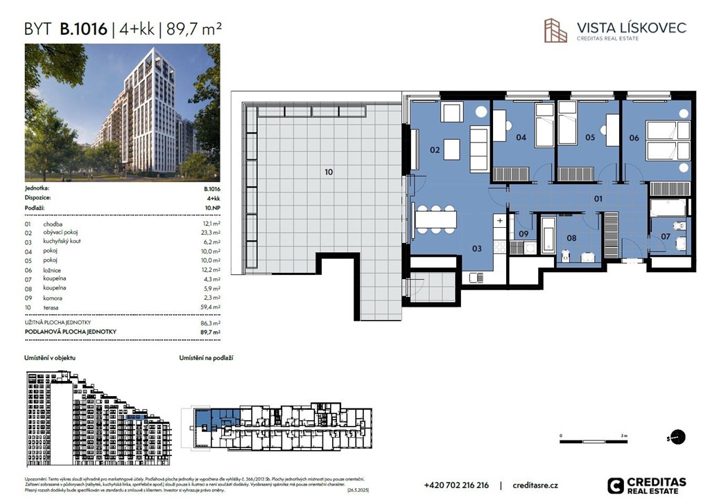 První etapa nového brněnského rezidenčního projektu Vista Lískovec je právě v prodeji! Nabízíme velkorysý byt 4+kk o celkové výměře 89,7 m2, umístěný v 10. nadzemním podlaží. Součástí bytu je prostorná terasa o výměře 59,4 m2 - ideální prostor pro relaxaci, pěstování bylinek i setkávání s přáteli. První etapa projektu nabídne celkem 260 promyšlených jednotek - od útulných 1+kk pro první bydlení až po rodinné 4+kk a prémiové mezonety v nejvyšších patrech. Většina bytů a ateliérů disponuje balkonem, přízemní jednotky nabízejí soukromé předzahrádky. Od devátého patra výše pak díky unikátnímu tvaru budovy vznikají prostorné terasy s dechberoucími výhledy na široké okolí a dostatkem místa pro trávení volného času. Jsou vybaveny integrovanými květníky, které zajišťují soukromí a nechybí ani praktický venkovní úložný prostor. V přízemí najdete komerční prostory pro služby, které zpříjemní život rezidentů. Samozřejmostí jsou garážová stání, sklepy, kolárna, myčka kol i uzavřený vnitroblok plný zeleně s dětským hřištěm a relaxačními zónami. Lokalita vás nezklame. Vista Lískovec se nachází v oblíbené části Brna - Starém Lískovci - jen pár kroků od zastávky šaliny Západní brána a v těsné blízkosti Jihlavské ulice. V pěší vzdálenosti máte školky, školy, nákupní centrum Campus Square, Fakultní nemocnici, kampus Masarykovy univerzity i sportovní areály. V okolí nechybí ani lesopark, přírodní rezervace Kamenný vrch nebo rozsáhlý park Bobrava. Plánované dokončení projektu je ve 4.Q roku 2028. Cena nezahrnuje dvě garážová stání a sklep - jednotková cena garážového stání je od 700 000 Kč vč. DPH, cena sklepu dle velikosti. Prodej probíhá přímo od developera. Pro více informací nás neváhejte kontaktovat.