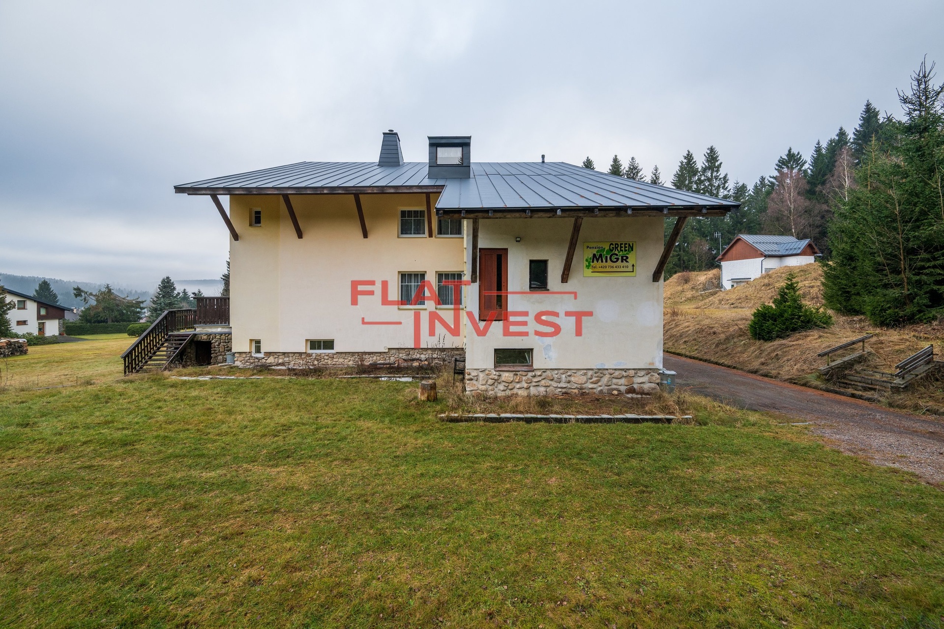 Prodej zavedeného pensionu v Harrachově - investiční příležitost s potenciálem apartmánového domu Nabízíme k prodeji zavedený pension v atraktivní horské lokalitě Harrachov, vhodný jak pro pokračování ubytovacího provozu, tak i jako výbornou investiční příležitost s možností přestavby na apartmánový dům. Pension se nachází v klidné části města, přibližně 100 m od autobusového nádraží ve směru k Mumlavským vodopádům. Centrum Harrachova a lanovky jsou dostupné přibližně 15 minut chůze. Samostatně stojící objekt s pozemkem nabízí dostatek soukromí i prostoru kolem domu. Topení a ohřev vody pro celý objekt zajišťují dva plynové kotle. Základní informace o objektu: - celkem 11 pokojů (2-4lůžkové) plus byt a kancelář majitele v přízemí - maximální kapacita až 38 lůžek - každý pokoj má vlastní koupelnu (sprcha, WC) - Wi-Fi připojení v celém objektu - nekuřácký pension - vlastní parkování přímo u domu - velmi dobrý technický stav, zděná stavba, balkony, kamenný sokl Vybavení a provoz: - společenská místnost se SAT TV - zajištění stravování ve vlastní restauraci v suterénu domu - možnost dalšího rozšíření či úprav dispozic - objekt je dlouhodobě využíván k ubytování Možnost přestavby - apartmánový dům Díky dispozici objektu, počtu pokojů, balkonům a samostatnému přístupu nabízí pension výborný potenciál pro přestavbu na apartmánový dům s několika samostatnými jednotkami. Tato varianta je ideální pro investory hledající: - rekreační apartmány k prodeji nebo pronájmu - kombinaci vlastního bydlení a investice - dlouhodobý i krátkodobý pronájem v žádané lokalitě Krkonoš Volnočasové aktivity v okolí: Běžkařská trasa přímo od pensionu (Vosecká bouda - Dvoračky) V létě je možné využívat cyklotrasy, možnost přejezdu do Polska, přírodní koupaliště a tenisové kurty cca 5 minut chůze od domu. Nemovitost v jedné z nejžádanějších horských lokalit ČR nabízí okamžitý provozní výnos i výrazný rozvojový potenciál do budoucna. Ideální pro investory, developery i zájemce o vlastní apartmánový projekt v Harrachově.