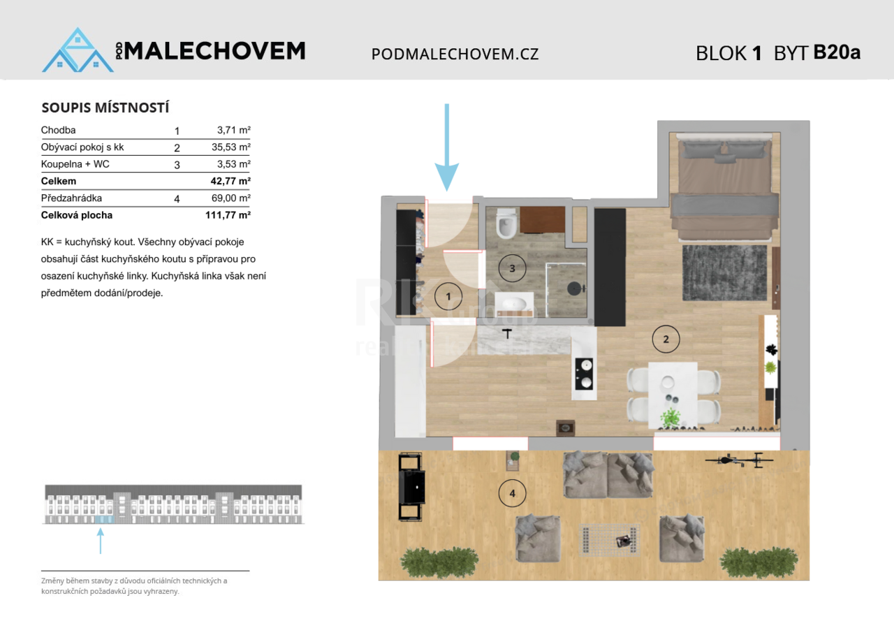 1B19b Prodej bytu, 1+kk, 41.98m2 + předzahrádka 68m2, projekt Pod Malechovem, Český Brod