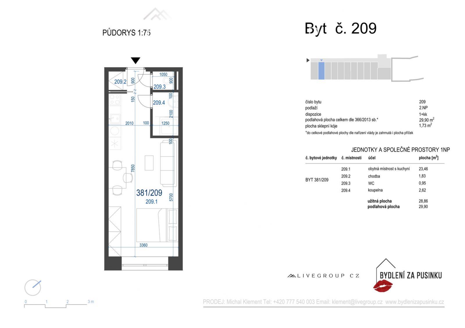 Nabízíme vám pronájem bytu v bytovém domě se 2.NP, který je umístěn v klidné lokalitě na okraji zástavby obce Zbýšova u Brna v bezprostředním sousedství s přírodou. Jedná se o nízkoenergetický bytový dům. Nabízený moderní, částečně vybavený byt 1+kk (381/209) se nachází v 2. nadzemním podlaží dvoupatrového domu. Celková výměra bytu činí 29,9 m2, k bytu náleží praktická sklepní kóje 1,73 m2, parkovací stání pro automobil. Byt s orientací na jih tvoří prostorná předsíň s místem pro vestavěnou skříň, obývací pokoj spojený s kuchyňským koutem i místem pro vybudování částečně oddělené ložnice o celkové velikosti 22,76 m2, koupelna se sprchovým koutem 2,78 m2 a samostatná toaleta 1,01 m2. Dispozice bytu zahrnuje obývací část s kuchyňským koutem vybaveným kvalitní kuchyňskou linkou se spotřebiči (trouba, sklokeramická deska, digestoř, lednice a pračka). Měsíční nájemné činí 10.500 Kč. Poplatky za společné domovní služby, topení, teplou a studenou vodu, elektřinu činí 3.500,- Kč měsíčně. V bytové jednotce byly použity kvalitní materiály a nabízí tak standardy vybavení, mezi které patří plastová okna s izolačními trojskly, elektricky ovládané předokenní žaluzie, centrální vytápění, vinylové podlahy a keramická dlažba. Byt se pyšní jižní orientací s výhledem do klidného vnitrobloku se zelení. Budova se nachází v bezprostřední blízkosti přírody a nabízí dětské hřiště nebo třeba pikniková místa, cyklostezky i okolí pro pěší turistiku. Lokalita nabízí vynikající občanskou vybavenost a dopravní dostupnost. V docházkové vzdálenosti od domu se nachází základní a mateřská škola, dětské hřiště, koupaliště, restaurace, obchody, pošta, lékárna i zdravotnické středisko včetně pediatrie. Jen 2 minuty pěšky se nachází zastávka autobusu, z které se dopravíte do okolních větších i menších obcí a města Brna. PENB budovy je kategorie B velmi úsporná a to díky FVE, která se nachází na střeše budovy. Byt je ideální volbou pro jednotlivce, páry, studenty. Pro více informací nás neváhejte kontaktovat.