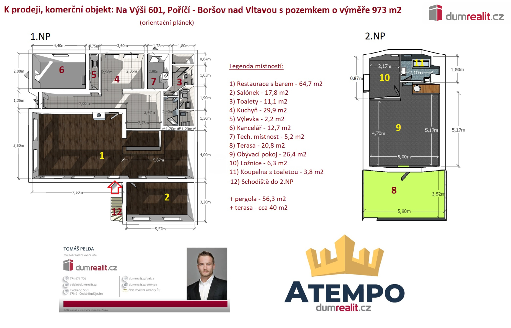Dumrealit.cz Vám zprostředkuje prodej vybaveného komerčního objektu - restaurace s terasou, kanceláří, bytem pro zaměstnance, dřevěným přístřeškem a parkováním na vlastním pozemku na lukrativním místě u silnice I. třídy směr České Budějovice - Kamenný Újezd, Na Výši 601, Poříčí - Boršov nad Vltavou, okr. České Budějovice. Prodávaný objekt s pozemkem je zapsaný na LV č. 42 v kú Boršov nad Vltavou; obec Boršov nad Vltavou. Objekt je zděný. Rozvody elektřiny a topení jsou v mědi. Voda a kanalizace jsou v plastu. Okna jsou z části plastová a z části dřevěná s izolačními dvojskly. Vchodové dveře jsou plastové. Objekt je připojený na veřejný vodovod, obecní kanalizaci, elektřinu a plyn. Vytápění objektu a ohřev teplé vody je plynovým kotlem, v restauraci je krb na tuhá paliva (vzduch - vzduch). Pozemek je dle územního plánu veden jako plochy pro občanské vybavení. Část pozemku je vyasfaltovaná a slouží k parkování. Místo, kde se objekt nachází, nabízí nespočet možností podnikání. Doporučuji prohlídku, objekt je připraven k okamžitému užívání. Zajistíme Vám financování a veškerý právní servis. Více informací Vám poskytne realitní makléř Tomáš Pelda z realitní kanceláře A TEMPO fungující pod ochrannou známkou dumrealit.cz. Ev. číslo: 653380. Energetický štítek: G