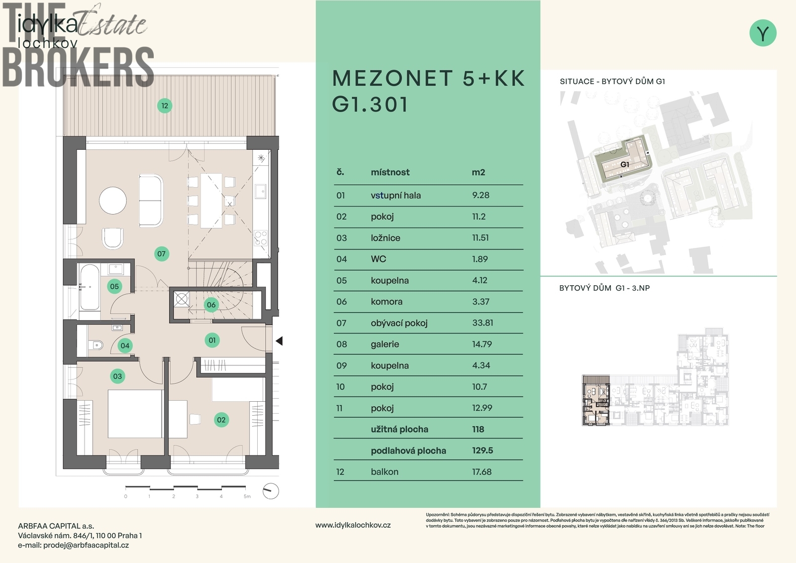 Světlý, mezonetový byt s dispozicí 5+kk a podlahovou plochou téměř 130 m2 - příjemný prostor pro život celé Vaší rodiny. Obývací pokoj s výměrou 34 m2 a balkonem přes celou šíři pokoje je orientovaný na východ. Klidová část zahrnující ložnici a jeden z pokojů zase na západ. Byt je velmi dobře dispozičně řešen a nachází se ve třetím a čtvrtém nadzemním podlaží. Jednoduše domov, který splňuje všechny Vaše představy - to může být Váš byt G1.301. Tento rozlehlý pětipokojový byt je ideální volbou pro ty, kdo hledají velkorysé rodinné bydlení se zajímavým architektonickým řešením. Byt je rozdělen na dvě úrovně. V dolním podlaží se nachází hlavní vstup do bytu. Vstupní hala poskytuje dostatek místa pro vestavnou šatní skříň. Z haly vedou samostatné vstupy do obývacího pokoje, ložnice, dalšího pokoje, sociálního zázemí. Pod schody je umístěna komora či šatna. Po schodech se dostanete na galerii, která tvoří dominantu horního podlaží, a odtud pak do dalších pokojů, které jsou prosvětleny velkými střešními okny. Tento byt nabízí flexibilitu v uspořádání, dostatek místa pro každého člena rodiny a jedinečné propojení klidové zóny s dynamickým společenským prostorem. Je to místo, kde se moderní design setkává s praktickými prvky pro pohodlné rodinné bydlení. Hlavní přednosti bytu G1.301: Velkoryse pojatý obývací pokoj s balkonem Samostatná koupelna na každém podlaží Orientace bytu na tři světové strany - východ, západ a sever Galerie s pracovnou „francouzská“ okna v obývacím pokoji Dostatek úložných prostor Projekt Idylka Lochkov nabízí spojení komfortního bydlení a ekologické odpovědnosti. Domy navržené podle nejnovějších trendů vynikají energetickou třídou A, která zajišťuje nízké provozní náklady a šetrnost k přírodě. Idylka Lochkov není jen místo, kde bydlíte - je to prostředí, které podporuje harmonii, klid a naplnění. Představte si domov, kde se setkává moderní design s přírodou, kde se pohodlí snoubí s funkčností, a kde každý detail byl navržen s ohledem na Vaše potřeby a přání. Idylka je více než obytný prostor - je to místo, které inspiruje k radosti, vytváří prostor pro společné okamžiky a nabízí útočiště před každodenním shonem. Ať už jste rodina, která hledá ideální místo pro své děti, nebo pár toužící po klidném zázemí, Idylka nabízí ideální prostředí pro všechny fáze Vašeho života. S důrazem na komunitu, udržitelnost a vyvážený životní styl věříme, že právě zde najdete to pravé místo, které můžete nazývat domovem. Přijďte objevit Idylku - domov, který vás vítá s otevřenou náručí a otevírá dveře k nové kapitole Vašeho příběhu.