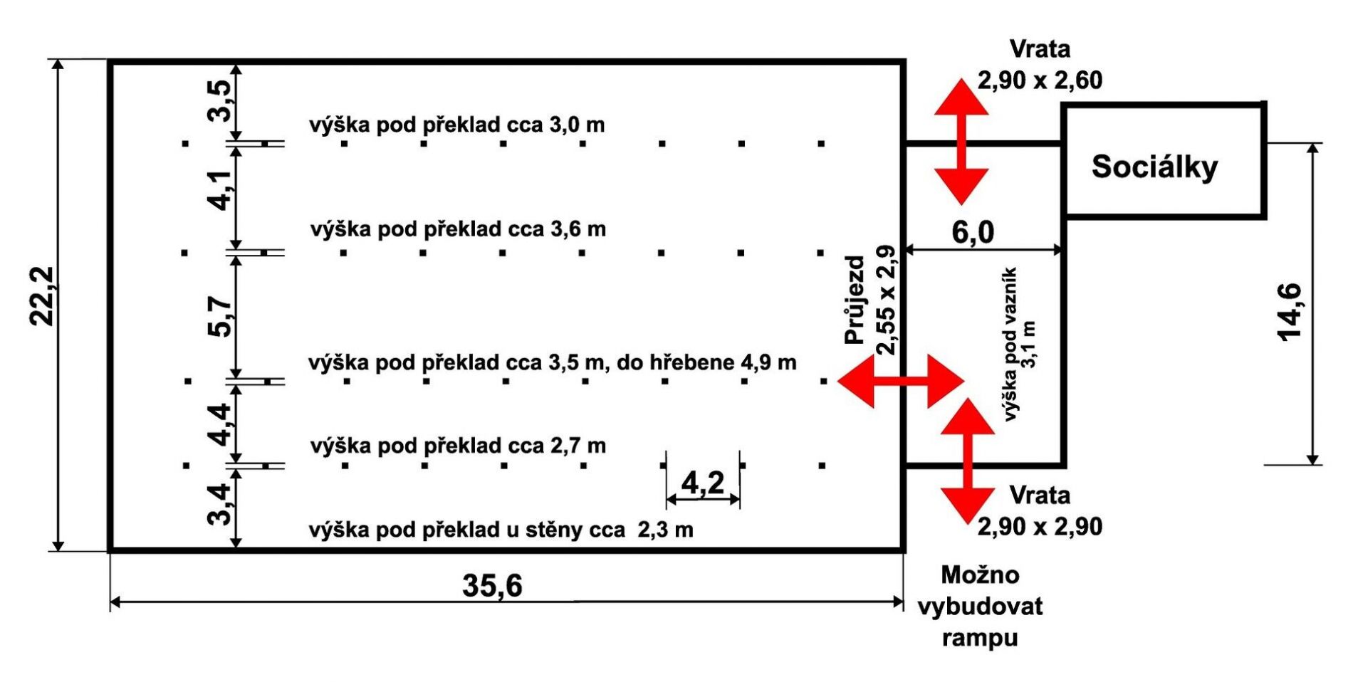 Pronajmeme nevytápěnou přízemní skladovací halu 878 m2 v Holohlavech, poblíž dálničního sjezdu. Stručný popis objektu: - zděná nezateplená a nevytápěná skladovací hala, - podlaha betonová, - hala se nachází uvnitř uzavřeného a udržovaného areálu vedle dálnice D11, cca 1.600 m od EXITU 104, - celková podlahová plocha 878 m2, - hala je tvořena dvěma vzájemně propojenými halovými prostory: -- hala 1 o výměře 88 m2 (14,6 m × 6,0 m), výška pod vazník 3,1 m, -- hala 2 o výměře 790 m2 (22,2 m × 35,6 m), výška pod překlady na sloupech 2,3 až 3,6 m, výška do hřebene v nejvyšším místě 4,9 m (viz nákres a obrázky), - hala 1 je plně otevřená (nerozdělená sloupy), hala 2 je rozdělena 4 řadami sloupů (rozložení sloupů viz nákres), - do haly 2 je přístup z úrovně terénu přes halu 1 dvěma dvoukřídlími vraty 2,9 × 2,9 m a 2,9 × 2,6 m, - před vraty 2,9 × 2,9 m je možno vybudovat nakládací rampu (nájezd se sníží pod úroveň terénu), - mezi halou 1 a halou 2 je průjezd 2,55 × 2,9 m, - z haly 1 je přístup do spojovacího krčku, ve kterém se nachází sociální zázemí (společné se sousední halou), které může být při požadavku nájemce rekonstruováno, - hala je napojená na elektrickou energii. Umístění a dopravní dostupnost: - přístup po zpevněné komunikaci i pro kamiony, - obec Holohlavy, - 1,6 km dálnice D11 (EXIT 104), - 10 km Hradec Králové, - 30 km Náchod, - 35 km Trutnov. Územní plán: - Celý areál je veden v územním plánu jako Plochy výroby a skladování lehký průmysl (VL) - Jsou určeny pro situování staveb lehké průmyslové výroby, kde negativní vlivy výroby nad přípustnou mez nepřekračují hranice areálu výrobny. Vymezují se v přímé návaznosti na plochy dopravní infrastruktury. - Převažující účel využití (hlavní využití): stavby a zařízení pro lehkou průmyslovou výrobu a skladování. Sklad neleží v záplavovém území.