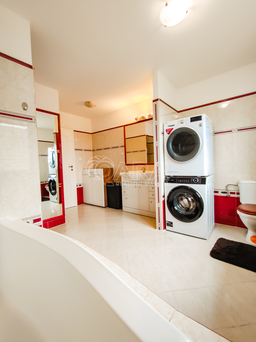 Nabízíme k prodeji prostornou a promyšleně řešenou vilu o dispozici 7+2, situovanou v klidné části obce Srubec, jen pár minut od centra Českých Budějovic. Cihlový dům s fotovoltaikou zaujme velkorysou užitnou plochou 334 m2, kvalitním zpracováním a možností oddělit dvě samostatné bytové jednotky. Jde o ideální kombinaci pro komfortní rodinné bydlení s investicí, jež může generovat pravidelný výnos či sloužit pro dvougenerační bydlení. Dispozice a technické zázemí V přízemí o ploše 212 m2 se nachází reprezentativní vstupní hala, komfortní předsíň a praktická technická místnost s vlastním vchodem - vhodná jako dílna nebo hobby prostor. Z haly vede vstup do dvou samostatných místností - ložnice a pracovny s vlastním vstupem pro případné klienty. Dále je zde koupelna s vanou, bidetem a toaletou, velká šatna a především obývací pokoj s krbem, propojený s moderní kuchyní a jídelním koutem. Kuchyně je plně vybavena vestavnými spotřebiči, navazuje na ni praktická spižírna a půlkruhový výklenek ideální pro rodinný jídelní stůl. Z obývacího pokoje je vstup na zastřešenou terasu a zahradu, kde se nachází skleník, okrasné dřeviny i malá vinice. Zeleň poskytuje naprosté soukromí a vytváří příjemnou atmosféru pro relax i rodinná setkání. Patro a možnost samostatné jednotky Do 1. patra (122 m2) vede elegantní dřevěné schodiště. Hala umožňuje přístup do všech místností: útulného obývacího pokoje s kuchyní a půlkruhovým balkónem s výhledem na Šumavu, tří pokojů (vhodné pro děti, hosty či pracovnu). Nechybí prostorná koupelna s vanou i sprchovým koutem a samostatnou toaletou. Z haly je také přístup na pochozí půdu - ideální pro uskladnění sezónních věcí. Horní patro lze snadno oddělit a využívat jako samostatný byt. Lokalita Srubec nabízí ideální kombinaci klidu a dostupnosti města. V okruhu 2 km se nachází škola, školka, hypermarket i obecní úřad, zastávka MHD je vzdálena pouhé 3 minuty chůze. Okolí je obklopeno přírodou a nabízí skvělé možnosti pro sport, procházky i odpočinek. Dům je vybaven plynovým kotlem (kombinace podlahového vytápění a radiátorů) a fotovoltaickou elektrárnou o výkonu 10 kWp s bateriovým úložištěm. Roční spotřeba domu činí pouhých 6 MWh, což zajišťuje energetickou úspornost a nízké provozní náklady. Přebytky je možné využít například na vytápění. V případě zájmu nás neváhejte kontaktovat a rádi zorganizujeme prohlídku této stylové nemovitosti.