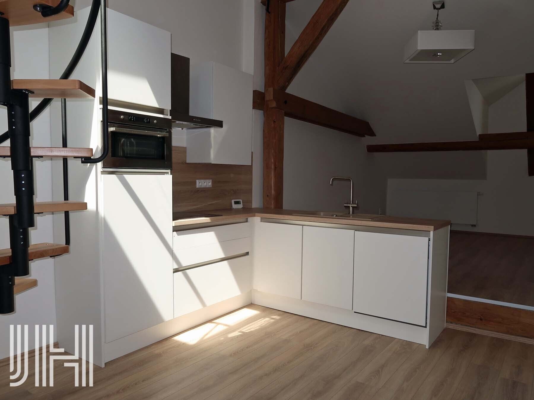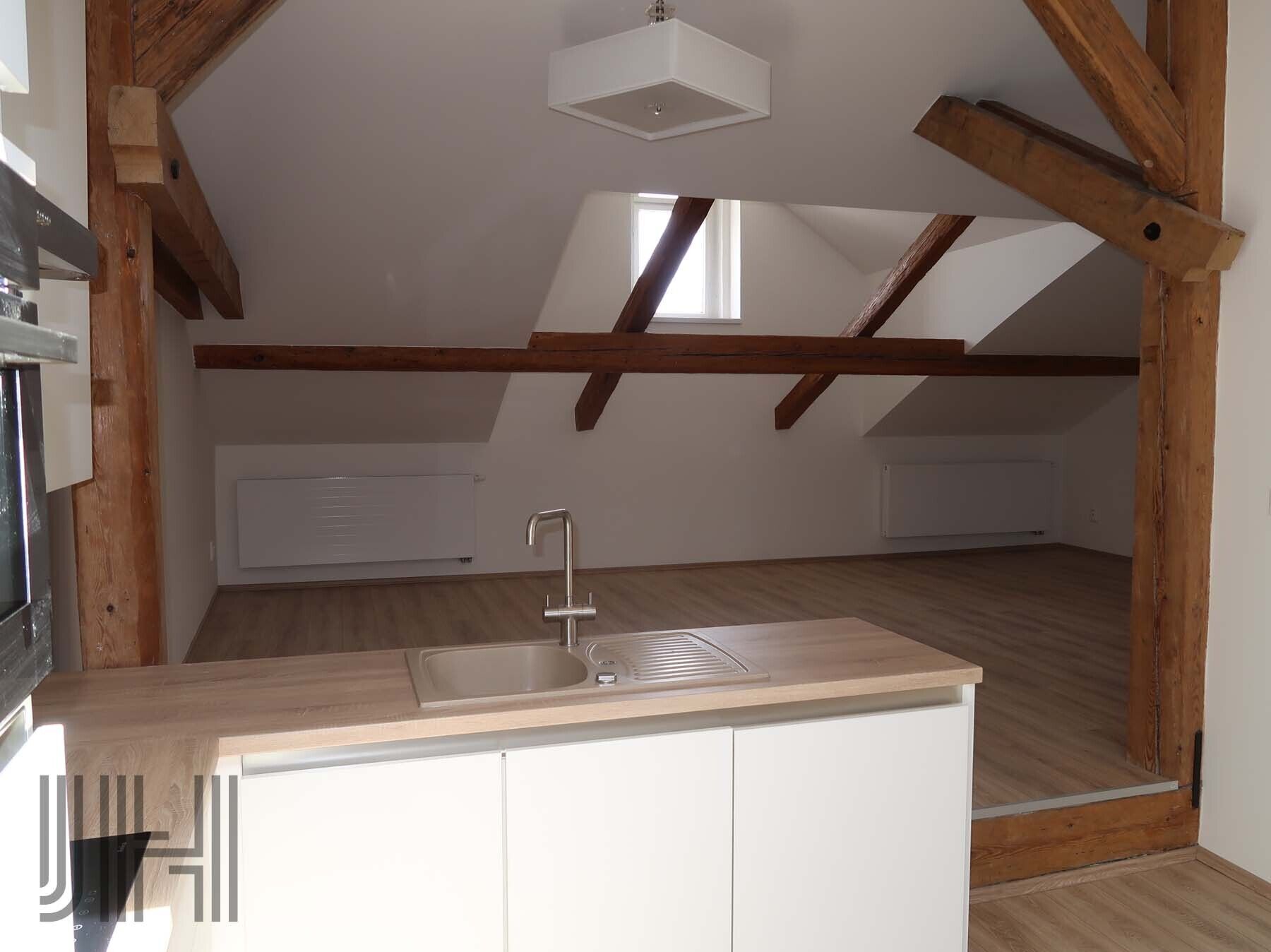 Nabízíme k prodeji byt vel. 4+kk v osobním vlastnictví, o výměře 111 m2, nacházející se ve 3. patře bytového domu přímo na náměstí T. G. Masaryka v Prostějově. Byt je celé podlaží domu, má vstupní chodbu, kuchyňský kout s točitým schodištěm na střechu domu, obývací pokoj s přiznanými nosnými trámy, tři pokoje, koupelnu (vana, umyvadlo, místo pro pračku a sušičku) a samostatné WC. V kuchyni je kuchyňská linka včetně spotřebičů. Byt má vlastní plynové vytápění i ohřev teplé vody kotlem umístěným na WC. Vlastní měřiče energií. Byt byl vybudován před 5 lety, nová koupelna, laminátové podlahy a veškeré rozvody instalací. K bytu je k dispozici společná kolárna v přízemí domu. Byt je v osobním vlastnictví, možnost financování koupě bytu hypotečním úvěrem. V domě je založeno společenství vlastníků, které zajišťuje správu domu. Nízké provozní náklady. PENB - G.