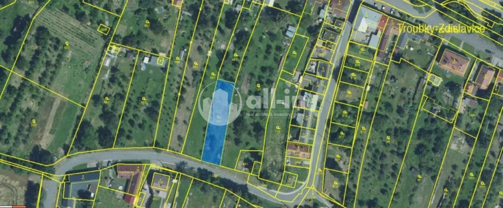 ALLIN-REALITY.CZ v exkluzivním zastoupení majitele nabízí k prodeji pozemek par.č. 69/4, zahrada o výměře 821 m2, dle územního plánu v oblasti BI - plochy pro individuální bydlení. K parcele vede asfaltová komunikace, přípojky na inženýrské sítě v dosahu. Uliční šíře cca 14 m, k dispozici souhlas souseda s umístěním stavby 1 m od hranice. Možné pro výstavbu 2 menších domků. Na nemovitosti neváznou žádná zástavní práva ani věcná břemena. Na pozemku nyní náletové dřeviny. Pozemek bude při prodeji vyčištěn. Obec Troubky-Zdislavice se nachází v okrese Kroměříž ve Zlínském kraji. Žije zde 424 obyvatel. Obec se skládá ze dvou částí, Troubek a Zdislavic. V současné době je obec vybavena veřejným vodovodem, plynovodem a obecní kanalizací. V obci funguje velké množství spolků, které se starají o kulturní a společenský život v obci. S financováním nemovitosti rádi pomůžeme.