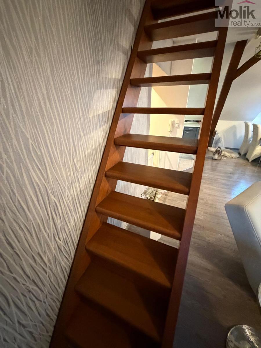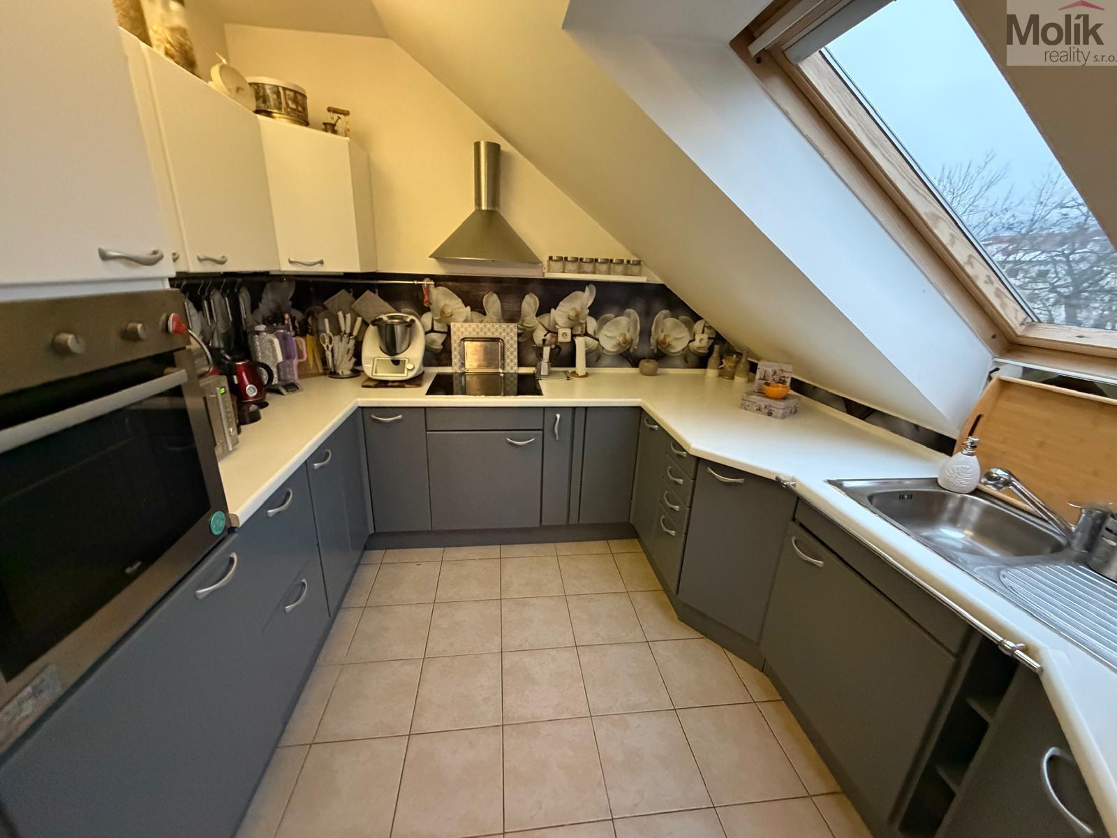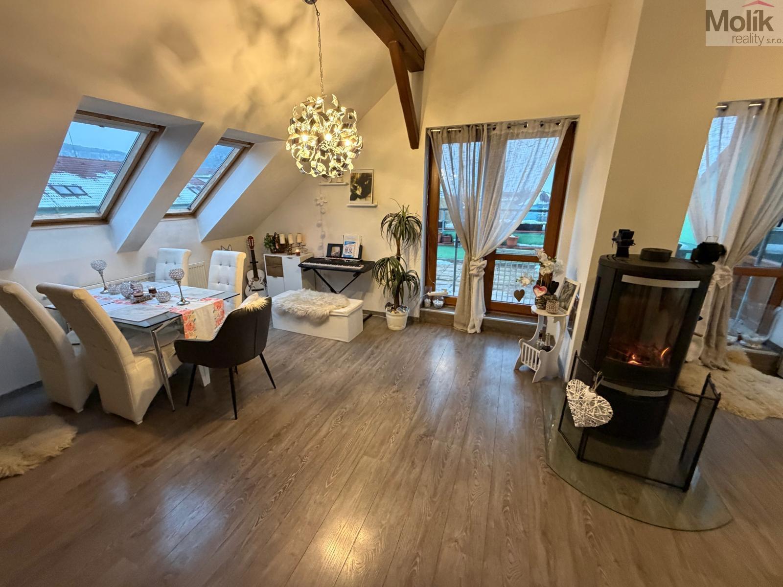 Nabízíme k prodeji podkrovní bytovou jednotku 4+1, o celkové výměře 112 m2, v osobním vlastnictví, s prostornou terasou. Byt je v slušném stavu, nabízí např. odpočinkovou místnost, nebo půdu. Jednotka se nachází ve 3. patře (4. NP) se sklepem. K bytu ještě náleží pozemek před domem. Byt se vytápí elektrokotlem nebo krbem, který udělá správnou atmosféru. Na terase se nachází prostor, který slouží třeba k uložení věcí.. Seriózní jednání. Možno financovat jinou nemovitostí na protiúčet (dům, byt, zahrada, garáž). Jedná se o velice vyhledávanou lokalitu. Prodává přímý vlastník, byt je bez dluhů a omezení. Více informací u uvedeného makléře 7 dní v týdnu.