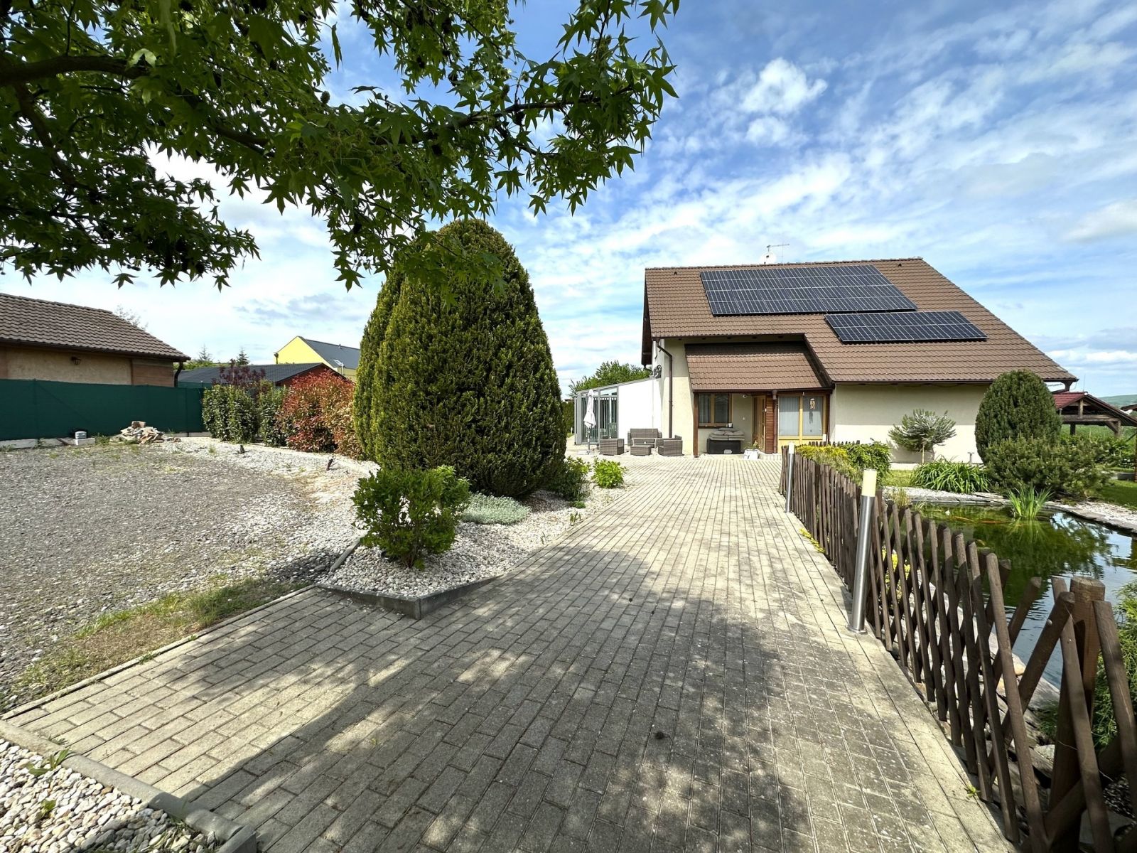 Hledáte rodinné bydlení, které kombinuje moderní technologie, maximální komfort a přírodu doslova za okny? Představujeme vám stylový dům 5+kk o užitné ploše 156 m s pozemkem o výměře 1070 m2, nacházející se v klidné a žádané lokalitě Jemníky u Mladé Boleslavi, jen pár minut jízdy od centra města a s výbornou dostupností do Prahy. Nemovitost byla zkolaudována v roce 2008 a v posledních letech prošla řadou modernizací včetně fotovoltaiky. Dispozice a vybavení: Přízemí: Vstupní chodba s vestavěným botníkem a věšákem na míru Chodbička s novými vestavěnými skříněmi (únor 2025) a posuvnými dveřmi Sapeli (listopad 2024) Technická místnost s pračkou, sušičkou, centrálním vysavačem Husky (2024), bojlerem, jističovou skříní, úložnými regály a zařízením k fotovoltaice Koupelna se sprchovým koutem a toaletou Kuchyně s novou kuchyňskou linkou a žulovou pracovní deskou, včetně ostrůvku Spotřebiče Bosch: nová trouba a digestoř (duben 2025), indukční deska, myčka, americká lednice, mikrovlnná trouba Žulová podlaha Obývací pokoj s dřevěnou podlahou, krbem a vstupem na prosklenou krytou pergolu Dřevěné schodiště do patra 1. patro: Prostorná ložnice s vestavěnými skříněmi po celé délce stěny Dva další pokoje (dětský pokoj a pracovna) Koupelna s vanou, toaletou a bidetem Chodba s přístupem na pochozí půdu (zateplená, obložená OSB deskami, umístěné zařízení pro internet 350 Mb/s a kamerový systém, malé střešní okno s přístupem na střechu - střecha Bramac) Vytápění: Elektrické podlahové topení v celém domě V patře navíc keramické panely s rychlým a úsporným ohřevem . Krbová kamna v obývacím pokoji Bezpečnost: Kamerový systém s mobilní aplikací Alarm napojený na centrální pult bezpečnostní služby Zahrada - oáza klidu a soukromí: Krytý bazén 4 × 8 m Prosklená pergola navazující na venkovní pergolu pro grilování Okrasné jezírko s Koi kapry (renovace duben 2025) Dětský herní prvek na míru: domeček, skluzavka, prolézačka, houpačky Dva zahradní domky na nářadí Studna pro zalévání Zahrada pravidelně udržovaná profesionálními zahradníky Další vybavení: Elektrická vjezdová brána, dálkové ovládání Moderní plot a branka z tah okovu Parkovací stání pro až 4 vozy uvnitř pozemku Lokalita: Obec Jemníky je tichá, čistá a přátelská lokalita vhodná pro rodiny i jednotlivce hledající klid a bezpečí mimo městský ruch, ale s výbornou dostupností k veškeré občanské vybavenosti. Mladá Boleslav 7 minut jízdy autem, Praha (Černý Most) 35 minut po D10. V místě naleznete školku, autobusovou zastávku, sportoviště, přírodu, cyklostezky. Pokud Vás naše nabídka zaujala, neváhejte kontaktovat makléře, s výhodným financováním či prodejem vaší nemovitosti rádi pomůžeme.