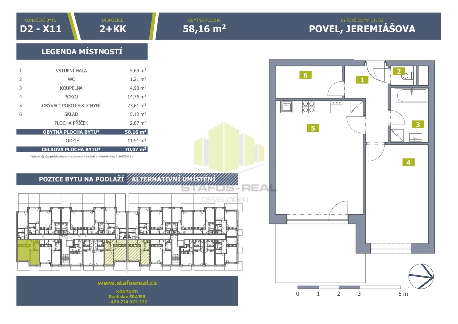 Vážení klienti, nabízíme Vám ke koupi nový moderní byt 2+kk, orientovaný na východ, situovaný v 6. NP bytového domu Jeremiášova ''D2'' v klidné a dlouhodobě vyhledávané lokalitě na ulici Jeremiášova v Olomouci. Tento dům je součástí pokračování úspěšného rezidenčního projektu Jeremiášova, který navazuje na předešlý projekt Janského. Tyto stavby postupně rozšiřují obytnou zónu městské části Povel o moderní cihlové domy s kvalitní architekturou a vysokým uživatelským komfortem. Čtvrť je žádaná díky své strategické poloze - blízkost centra města, FN, hlavní příjezdové komunikace i zastávky MHD. V docházkové vzdálenosti se nachází kompletní občanská vybavenost, což z lokality činí ideální místo pro pohodlné bydlení. Bytový dům D2 je aktuálně ve výstavbě, předpokládaný termín dokončení a kolaudace přelom roku 2027/2028. V rámci výstavby je možné na přání klienta realizovat široké klientské změny (úprav dispozice bytu, výběr designu zásuvek atd.). Byt je možné kompletně navrhnout „na klíč“ dle Vašich představ. V ceně není zahrnuta kuchyňská linka a poplatek za osazení elektroměru ČEZ. Standardní vybavení zahrnuté v ceně odpovídá současným nárokům na moderní a komfortní bydlení: vinylové podlahy, dřevěné obložkové zárubně, interiérové dveře s CPL povrchem, moderní keramické obklady, značková sanita, francouzská okna a okna s trojskly. V příplatkovém standardu lze doplnit například teplovodní podlahové vytápění, přípravu na klimatizaci či přípravu pro venkovní žaluzie. Výjimečnost projektu podtrhuje celkové technické řešení: energeticky úsporné bydlení v třídě PENB B, kvalitní akustické a tepelné oddělení chodeb od prostoru výtahu a schodiště, zátěžové koberce v chodbách, čisticí zóna u vstupu, moderní výtah, bezbariérový přístup a především prostorné balkony či lodžie a šatní komory, dále přímosousedící komory na patře jako samostatný úložný prostor u vybraných bytů. Byty nabízejí příjemné výhledy do soukromého rezidenčního vnitrobloku a poskytují soukromí i pohodlí uprostřed krajského města. Velkou výhodou jsou také výborné možnosti parkování. Dům je atraktivní kombinací klidného rezidenčního prostředí, skvělé dopravní dostupnosti, moderních technologií a nadstandardního poměru ceny a kvality. Lokalita umožňuje rychlý příjezd na dálnici a nabízí vše potřebné v bezprostředním okolí. Kupte si nový byt od prověřeného a spolehlivého developera s garantovanou pevnou cenou bez navýšení a bez inflačních doložek. Využijte jedinečné příležitosti nechat si navrhnout a postavit byt přesně podle Vašich přání a potřeb. Společnost STAFOS-REAL působí na trhu od roku 2005, za tuto dobu úspěšně realizovala téměř tři tisícovky bytových jednotek a klientům poskytuje kompletní servis - vlastní výstavbu, výhradní prodej i služby vlastního hypotečního centra, které Vám zdarma zajistí vyřízení financování s připravenými výhodami. Pro investory nabízíme navíc bezplatné zajištění následného pronájmu a správy. Těšíme se na setkání. Rastislav Šrajer, zástupce společnosti