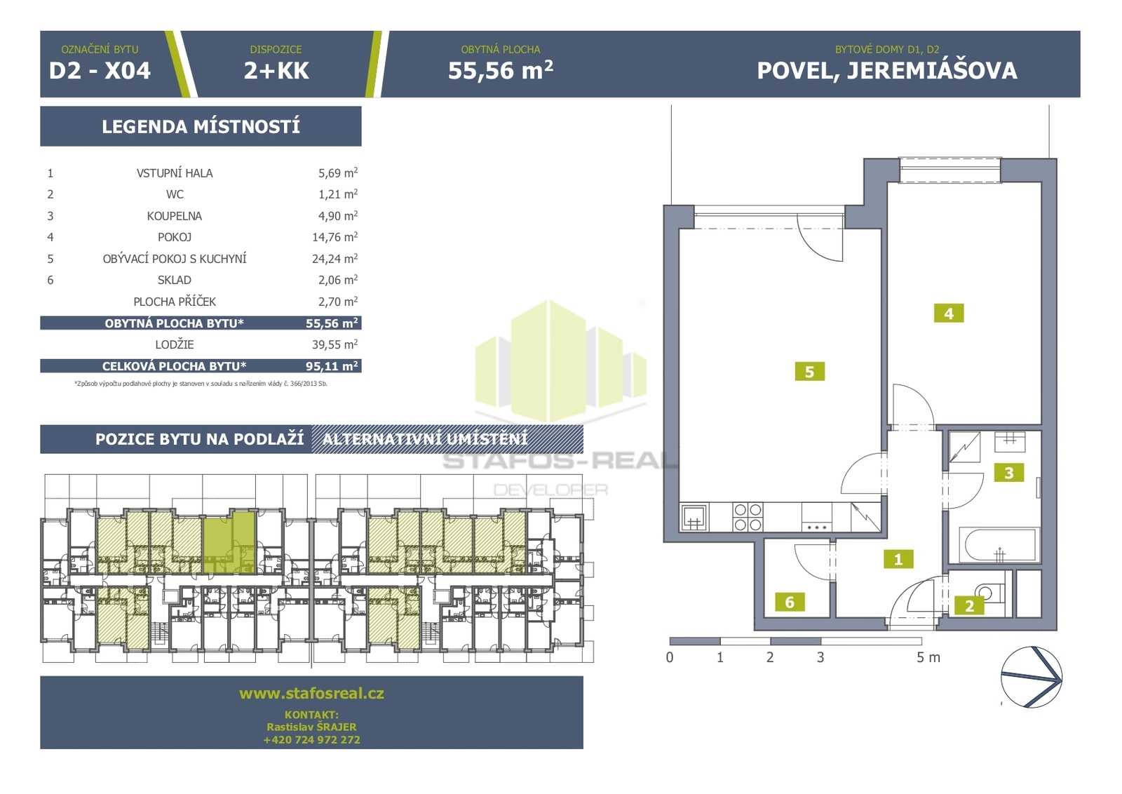 Vážení klienti, nabízíme Vám ke koupi nový moderní byt 2+kk, orientovaný na západ, situovaný v 3. NP bytového domu Jeremiášova ''D2'' v klidné a dlouhodobě vyhledávané lokalitě na ulici Jeremiášova v Olomouci. Tento dům je součástí pokračování úspěšného rezidenčního projektu Jeremiášova, který navazuje na předešlý projekt Janského. Tyto stavby postupně rozšiřují obytnou zónu městské části Povel o moderní cihlové domy s kvalitní architekturou a vysokým uživatelským komfortem. Čtvrť je žádaná díky své strategické poloze - blízkost centra města, FN, hlavní příjezdové komunikace i zastávky MHD. V docházkové vzdálenosti se nachází kompletní občanská vybavenost, což z lokality činí ideální místo pro pohodlné bydlení. Bytový dům D2 je aktuálně ve výstavbě, předpokládaný termín dokončení a kolaudace přelom roku 2027/2028. V rámci výstavby je možné na přání klienta realizovat široké klientské změny (úprav dispozice bytu, výběr designu zásuvek atd.). Byt je možné kompletně navrhnout „na klíč“ dle Vašich představ. V ceně není zahrnuta kuchyňská linka a poplatek za osazení elektroměru ČEZ. Standardní vybavení zahrnuté v ceně odpovídá současným nárokům na moderní a komfortní bydlení: vinylové podlahy, dřevěné obložkové zárubně, interiérové dveře s CPL povrchem, moderní keramické obklady, značková sanita, francouzská okna a okna s trojskly. V příplatkovém standardu lze doplnit například teplovodní podlahové vytápění, přípravu na klimatizaci či přípravu pro venkovní žaluzie. Výjimečnost projektu podtrhuje celkové technické řešení: energeticky úsporné bydlení v třídě PENB B, kvalitní akustické a tepelné oddělení chodeb od prostoru výtahu a schodiště, zátěžové koberce v chodbách, čisticí zóna u vstupu, moderní výtah, bezbariérový přístup a především prostorné balkony či lodžie a šatní komory, dále přímosousedící komory na patře jako samostatný úložný prostor u vybraných bytů. Byty nabízejí příjemné výhledy do soukromého rezidenčního vnitrobloku a poskytují soukromí i pohodlí uprostřed krajského města. Velkou výhodou jsou také výborné možnosti parkování. Dům je atraktivní kombinací klidného rezidenčního prostředí, skvělé dopravní dostupnosti, moderních technologií a nadstandardního poměru ceny a kvality. Lokalita umožňuje rychlý příjezd na dálnici a nabízí vše potřebné v bezprostředním okolí. Kupte si nový byt od prověřeného a spolehlivého developera s garantovanou pevnou cenou bez navýšení a bez inflačních doložek. Využijte jedinečné příležitosti nechat si navrhnout a postavit byt přesně podle Vašich přání a potřeb. Společnost STAFOS-REAL působí na trhu od roku 2005, za tuto dobu úspěšně realizovala téměř tři tisícovky bytových jednotek a klientům poskytuje kompletní servis - vlastní výstavbu, výhradní prodej i služby vlastního hypotečního centra, které Vám zdarma zajistí vyřízení financování s připravenými výhodami. Pro investory nabízíme navíc bezplatné zajištění následného pronájmu a správy. Těšíme se na setkání. Rastislav Šrajer, zástupce společnosti