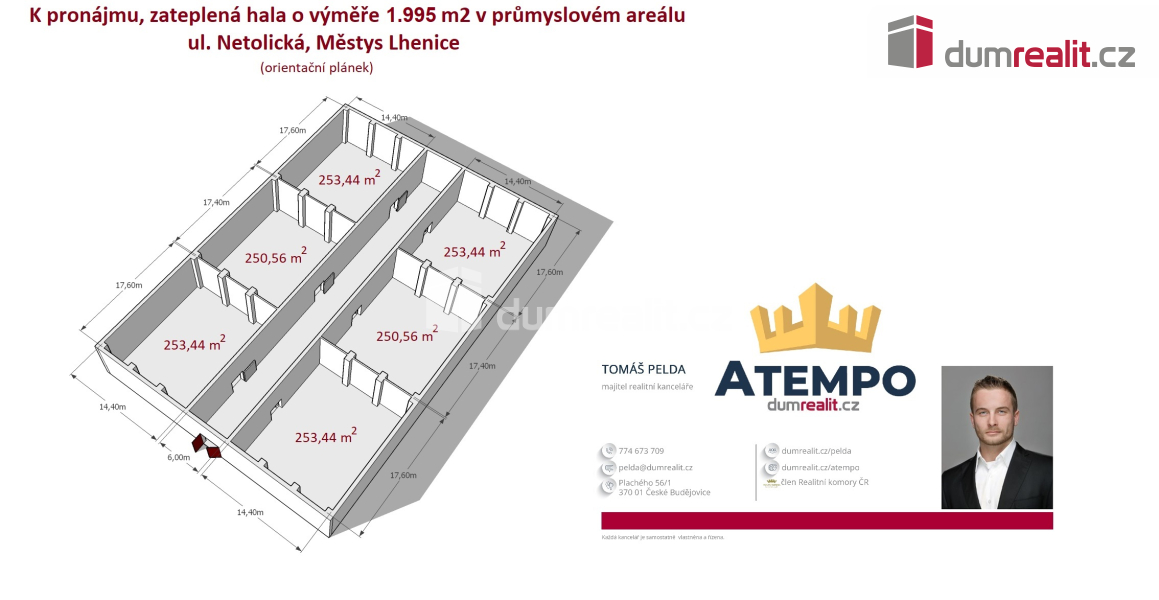 Dumrealit.cz Vám zprostředkuje pronájem skladovací zateplené haly o podlahové ploše 1.582 m2 v uzavřeném areálu v městys Lhenice, ul. Netolická. Možnost pronájmu zpevněných ploch kolem haly. Halu lze pronajmout na samostatné bloky. Více informací Vám poskytne realitní makléř Tomáš Pelda z realitní kanceláře A TEMPO fungující pod ochrannou známkou dumrealit.cz. Ev. číslo: 654218. Energetický štítek: G