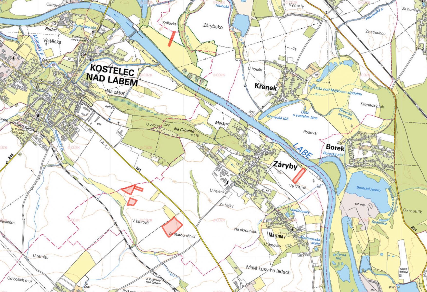 Nabízíme k prodeji zemědělskou půdu v žádaných okresech Praha-východ a Mělník. V katastrálním území Záryby (okres Praha-východ) jsou pozemky zapsány na LV 983 a jedná se o parcely č. 447/1, 337/1, 447/2, 807 a 442/1, které jsou vedeny jako orná půda. V katastrálním území Kostelec nad Labem (okres Mělník) jsou pozemky zapsány na LV 1112 a jedná se o parcelu č. 1400/32 s druhem trvalý travní porost a parcelu č. 1399/23 s druhem orná půda. Území je součástí úrodné a rovinaté Polabské nížiny. Celková výměra pozemků činí 82 106 m, z toho je k prodeji 24 776 m, přičemž 23 680 m tvoří orná půda a 1 096 m trvalý travní porost. Chcete-li získat více informací, neváhejte mě kontaktovat telefonicky nebo e-mailem. Pozemky nabízím k prodeji v zastoupení vlastníka. Majitel si vyhrazuje právo vybrat kupujícího na základě nabídky.