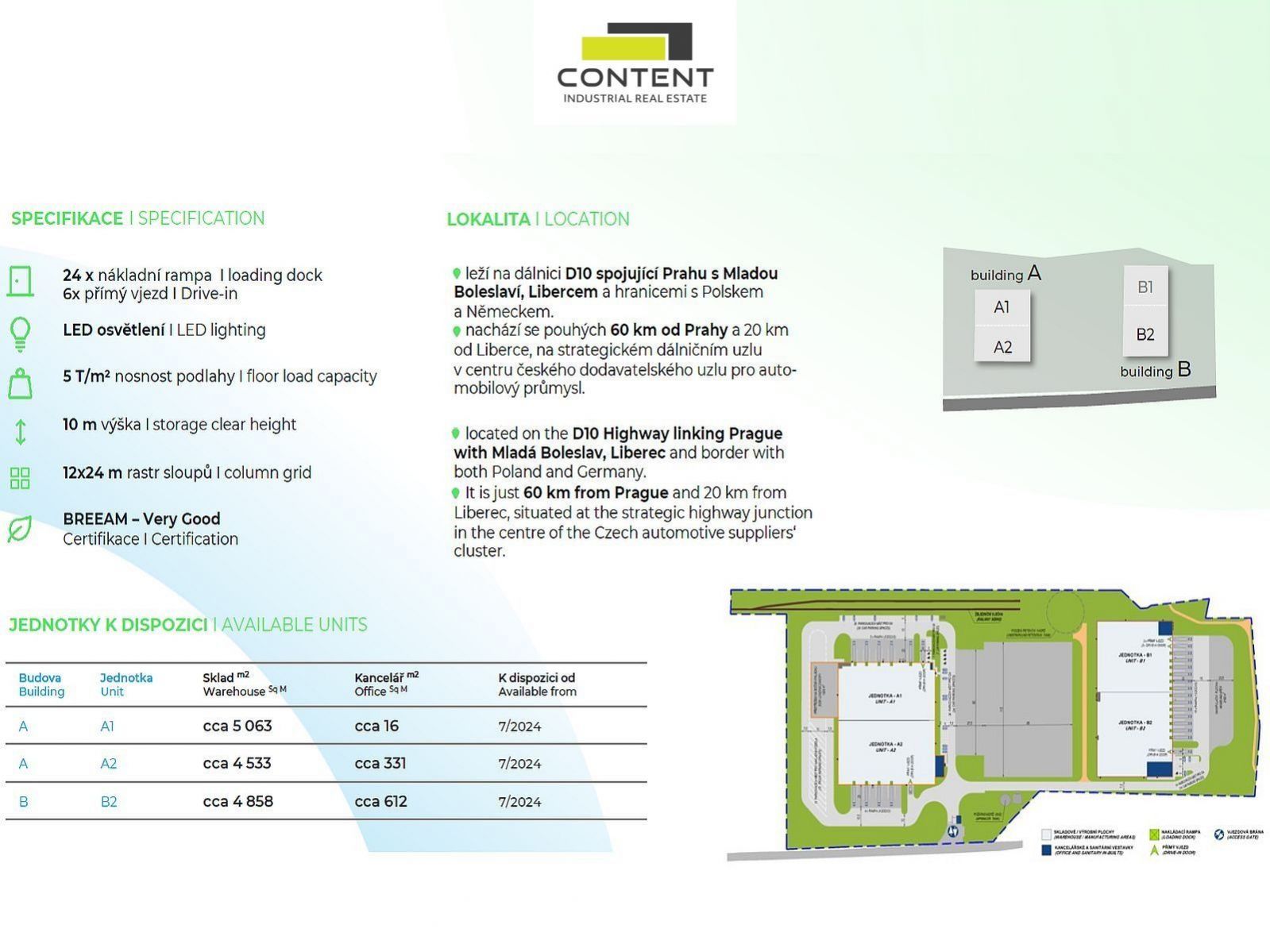 Pronájem industriálních prostor Příšovice. V zastoupení majitele a bez provize nabízíme novostavbu výrobních nebo skladových prostor o velikosti 5079 m, umístěných v rámci průmyslového areálu s ostrahou, u exitu E67 z dálnice D10. Areál se nachází 25 km od hlavního výrobního závodu Škoda Auto Mladá Boleslav. - k dispozici ihned (jednotka B2) - skladová/výrobní plocha 2000 - 5079 m - nové bezprašné podlahy s minimální nosností 5 t/m, - moderní, úsporná budova s certifikátem udržitelnosti BREEAM - "very good", - 5x hydraulická rampa - 1x drive-in (přímý vjezd) - světlá výška 10,5 m, - sociální a kancelářské zázemí na míru, - úsporné LED osvětlení, sprinklery, - příjezd a parkování TIR bezproblémové, - oplocený areál s ostrahou, EZS, EPS - vzdálenost 1,9 km od exitu E67 z dálnice D10, - v areálu k dispozici samostatné jednotky od cca 3000 m - 10000 m - možnost budoucí expanze v rámci areálu, - možnost napojení na železniční vlečku, Cena bude stanovena individuálně dle konkrétních podmínek smlouvy. Pro více informací nás kontaktujte. Doporučujeme prohlídku nemovitosti.