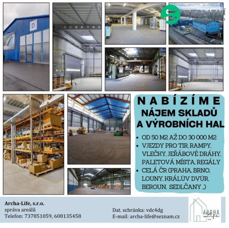 Nabízíme do nájmu krásné skladové, temperované prostory od 800 m2 nedaleko od ROKYCAN, směr Holoubkov. Sklad se nachází v těsné blízkosti Dálnice D5, je z ní viditelný, sjezd přes Exit ROKYCANY. Kanceláře a zázemí ke skladu jsou moderní, dostačující. Nájem venkovních skladových či odstavných ploch u haly Velikost skladů: do 800 m2 Velikost kanceláří: až 350 m2 Velikost venkovních ploch: až 6000 m2 Cena nájmu skladu: 95 Kč/m2/měsíc Cena nájmu kanceláří: 140 Kč/m2/měsíc Cena nájmu venkovních ploch: 25 Kč/m2/měsíc Skladová hala je novostavba, prostory jsou hodné pro dlouhodobé skladování - aktuálně nevytápěno. Výška skladu je 7 m. Vhodné i pro regálové systémy - kvalitní betonová podlaha, nosné středové sloupy. Více vstupů pro zásobování i TIR do skladových prostor. Na sklad navazuje administrativní budova se zázemím pro stávající nájemce. K dispozici je WC, sprchy, šatny, kanceláře, Internet, EPS. Před administrativní budovou je parkoviště pro nájemce a návštěvy areálu. Další venkovní prostory jsou betonové plochy, vhodné pro parkování souprav, uložení kontejnerů, zboží a materiálu. Vše osvětleno a hlídáno elektronickou ostrahou. Nájem i rezervace možno ihned. Provizi neplatíte Archa-Life, s.r.o. Telefon: 737851059, 608135458 Dat. schránka: vdc4dg E-mail: archa-life@seznam.cz FCB/Archa.Life.sklady Č.: RS705548