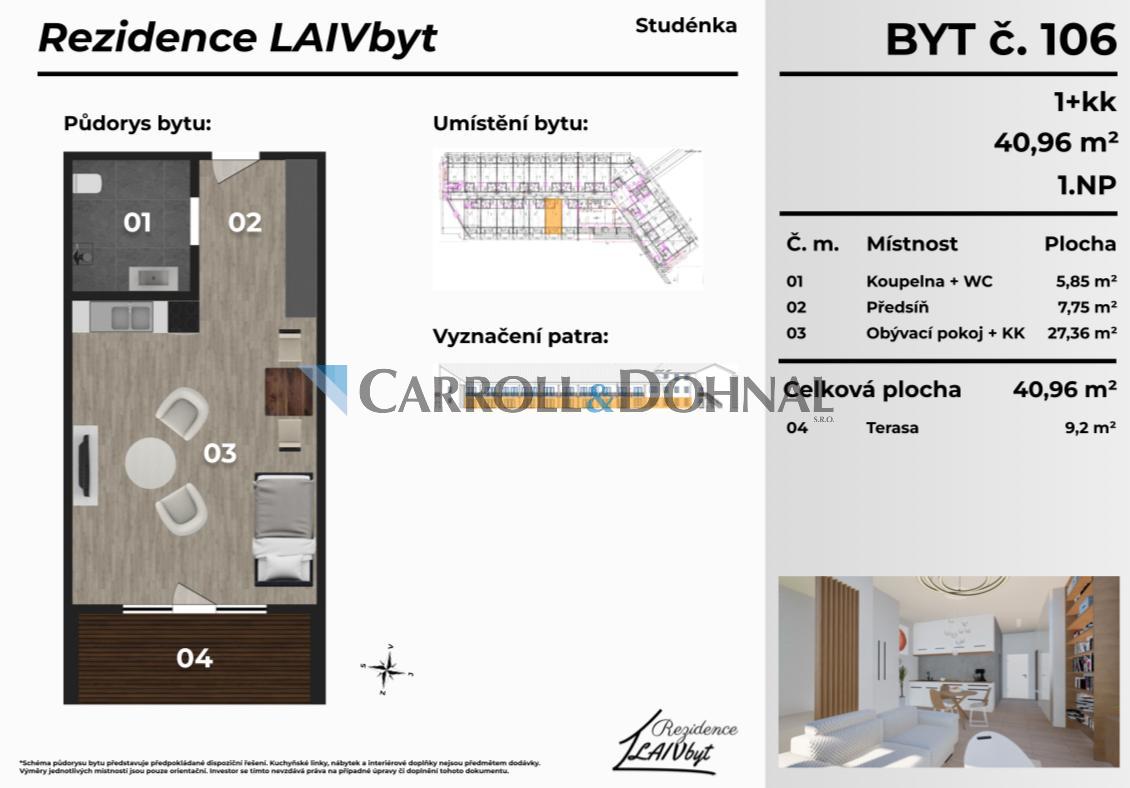 Prodej bytu 1+kk, 40,96m2 s předzahrádkou, 15m2, nový developerský projekt LAIVbyt Studénka
