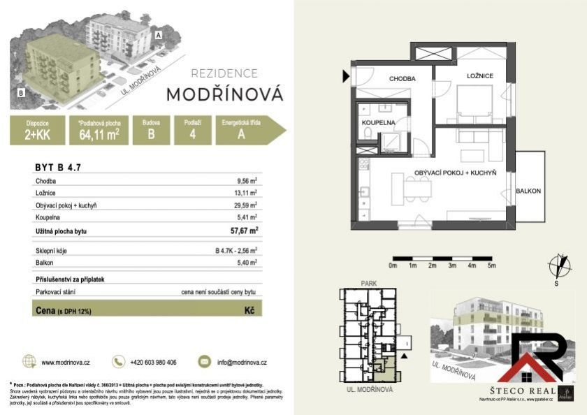 Nabízíme k prodeji byt v developerském projektu Rezidence Modřinová, nacházející se na ulici Modřínová v Třebíči. Tento projekt je novostavbou, která se dokončí v BŘEZNU- DUBNU 2026, což představuje jedinečnou investiční příležitost. Jedná se o moderní byt o dispozici 2 + kk, s plochou 64,11 m, umístěný ve 4. nadzemním podlaží cihlového objektu. Projekt splňuje přísné normy moderní výstavby a pyšní se energetickým štítkem třídy A. Byt bude vybaven elektrickými předokenními roletami, což zajistí komfortní bydlení po celý rok. Velmi dobře nastavený platební kalendář ponechává budoucím majitelům flexibilitu v oblasti financování. Výhodou této nemovitosti je, že projekt staví místní stavební firma TOMIreko a.s., která má více než 15 let zkušeností ve stavebnictví. Díky tomu se můžete spolehnout na vysokou kvalitu provedení a spolehlivost. Díky blízkosti k Jaderné elektrárně Dukovany je tento projekt velmi zajímavou volbou pro investory, kteří hledají zajištěnou návratnost. Kromě výhodné lokalizace se obyvatelé mohou těšit na kvalitní infrastrukturu a všechny potřebné služby v dosahu. V případě zájmu o prohlídku nás neváhejte kontaktovat.