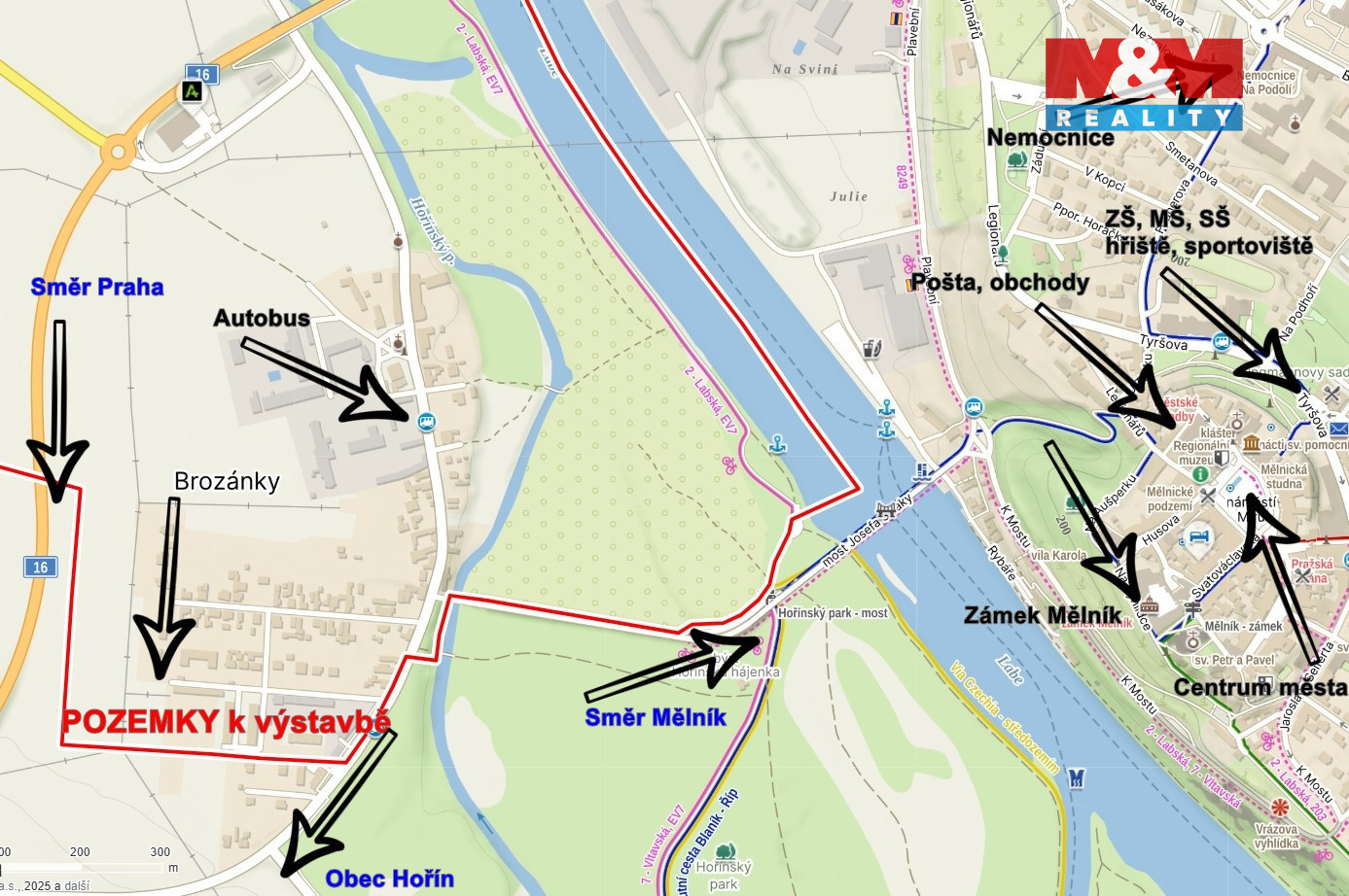 Nabízíme k prodeji rovinatý pozemek o výměře 992 m2, určený pro výstavbu rodinného domu v klidné části obce Hořín-Brozánky, v bezprostřední blízkosti Mělníka. Pozemek je součástí komorního rezidenčního projektu s devíti moderními rodinnými domy, který klade důraz na soukromí, bezpečnost a klidné bydlení. Celý areál je navržen jako uzavřený komplex se soukromým vjezdem opatřeným automatickou bránou a kompletním oplocením. Pozemek je plně zasíťovaný - elektřina i ostatní inženýrské sítě jsou již vybudovány. Dokončení příjezdové komunikace a oplocení do konce dubna. Dle územního plánu je povolena výstavba rodinného domu o jedné bytové jednotce se zastavěností až 40 %. Lokalita nabízí ideální kombinaci klidného bydlení a výborné dostupnosti. Centrum Mělníka je vzdáleno pouhé 3 minuty jízdy, dálnice D8 přibližně 5 minut a do části Praha-Letňany se dostanete zhruba za 25 minut. Samozřejmostí je také vlakové a autobusové spojení v Mělníku. Atraktivní nabídka pro pohodlné rodinné bydlení.