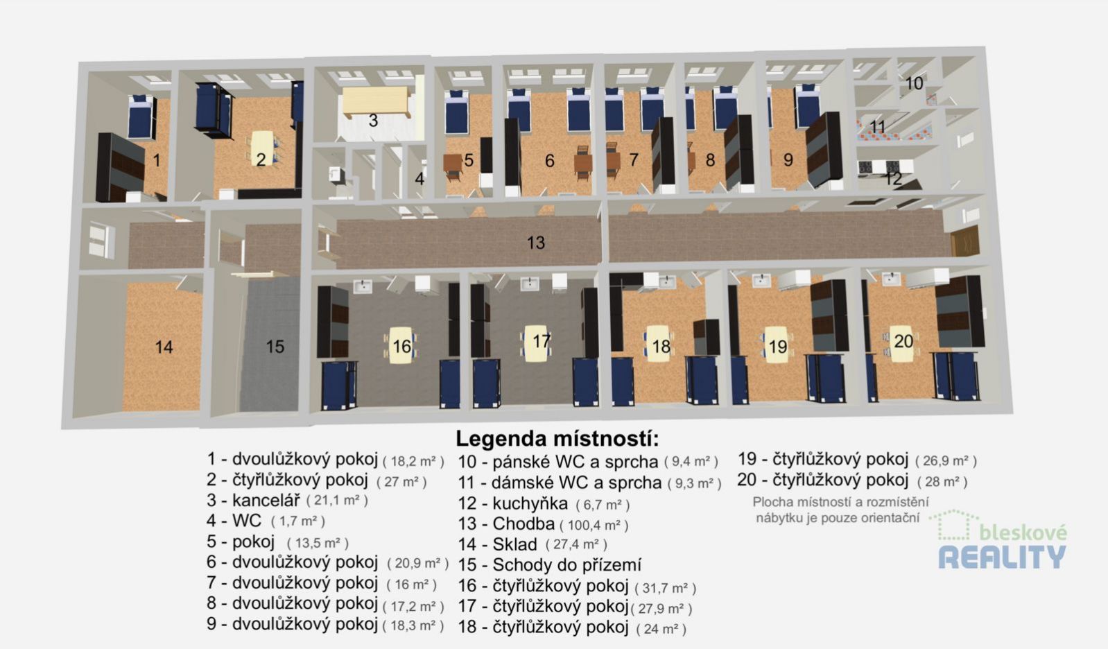 Nabízíme k pronájmu komerční zařízení pro ubytování o celkové ploše 445,6 m s kapacitou až 36 osob. Prostory se nacházejí v 1. patře objektu. Zařízení se pronajímá výhradně jako celek (nikoliv po jednotlivých pokojích). Dispozice: 6× čtyřlůžkový pokoj 6× dvoulůžkový pokoj hlavní kuchyňka + menší kuchyň oddělené dámské a pánské sociální zařízení kancelář (možnost úpravy na další pokoj) sklad (možnost úpravy na další pokoj) Vybavení: postele/palandy, skříně, lednice umyvadlo ve většině pokojů pračka v přízemí internet v objektu samostatné měření elektřiny Část pokojů je po rekonstrukci, část v původním stavu. Úpravy možné po dohodě s nájemcem. Lokalita: Objekt se nachází u fotbalového hřiště v Přerově nad Labem. parkování až pro 8 vozidel autobusová zastávka cca 13 minut pěšky potraviny cca 16 minut pěšky v přízemí objektu je bufet/hospůdka (samostatný provoz, není součástí pronájmu) Vhodné zejména pro agenturní nebo firemní ubytování zaměstnanců či dlouhodobé provozování ubytování. Nájemné: 80 000 Kč/měsíc + energie K dispozici dle dohody. Pro více informací nebo domluvení prohlídky nás kontaktujte.