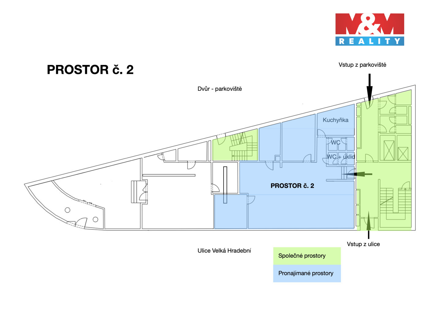 Hledáte-li obchodní prostory vhodné pro kancelářské účely, služby i obchod, tak Vám nabízíme tři varianty pronájmu na lukrativním místě v Ústí n/L. První možností je pronájem prostor s výměrou cca 130 m2 a druhou je prostor s výměrou cca 150 m2 za jednotlivou cenu 40 000,- Kč za jeden měsíc. Nebo můžete využít jako třetí možnost pronájem prostor jako celku za cenu 80 000,- Kč za jeden měsíc. Uvedené nájmy jsou bez DPH (u neplátců se DPH nehradí) a je k nim účtována spotřeba energií na základě skutečné spotřeby dle měsíčních odečtů instalovaných měřidel (elektrická energie, vodné a stočné a topení) a odvoz komunálního odpadu + DPH. Všechny prostory disponují vlastním WC/úklidovou komorou, kuchyňkou a jsou klimatizovány. Přístup do objektu je z ulice u křižovatky Velká Hradební/Pařížská/Dlouhá s celoplošnými výlohami směrem do ulice. Výhodou jsou parkovací místa v zadním traktu budovy za cenu 12 000,- Kč/rok + DPH. Pronajímatel nepožaduje žádnou kauci, hradíte provizi za zprostředkování.