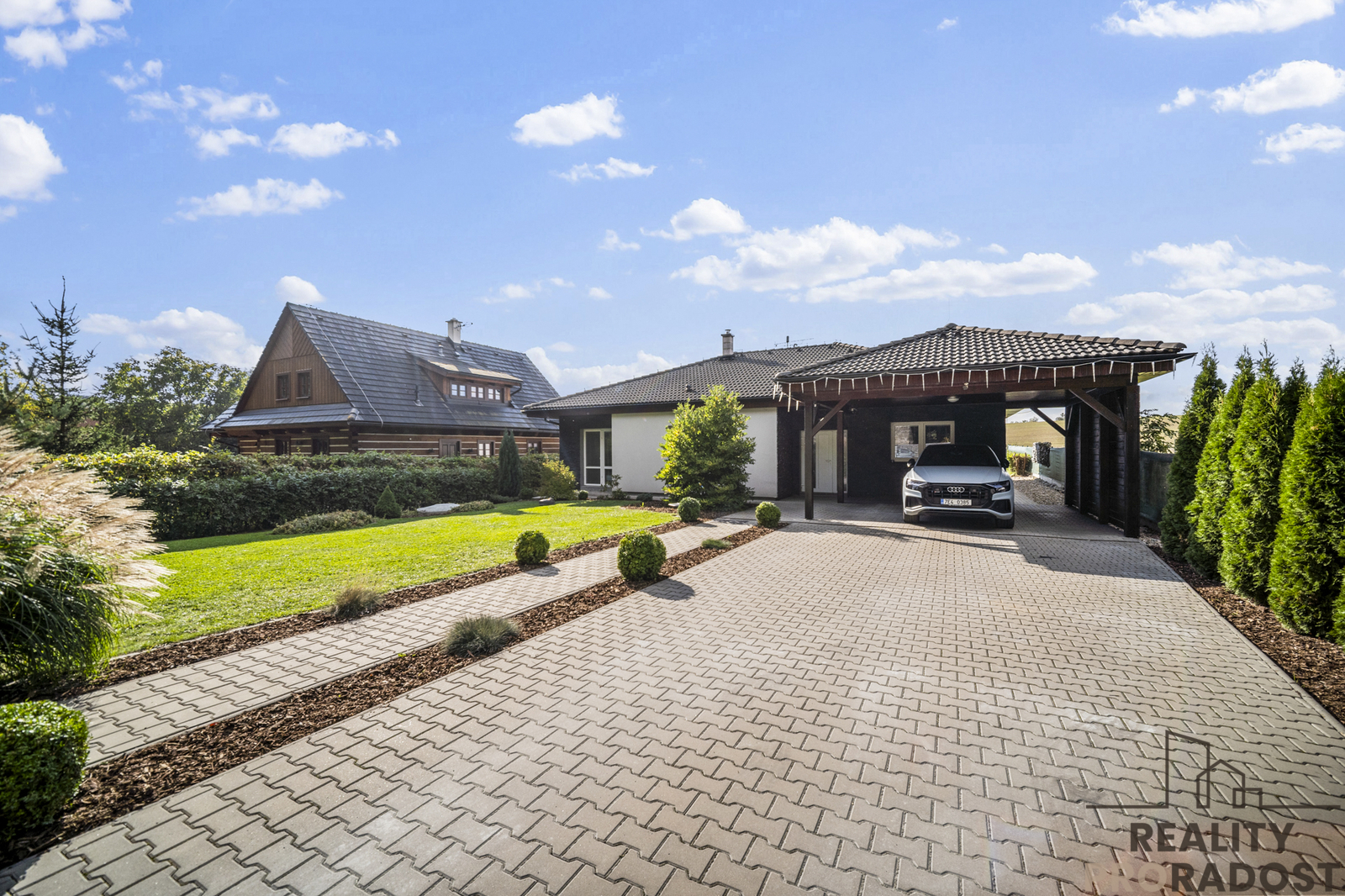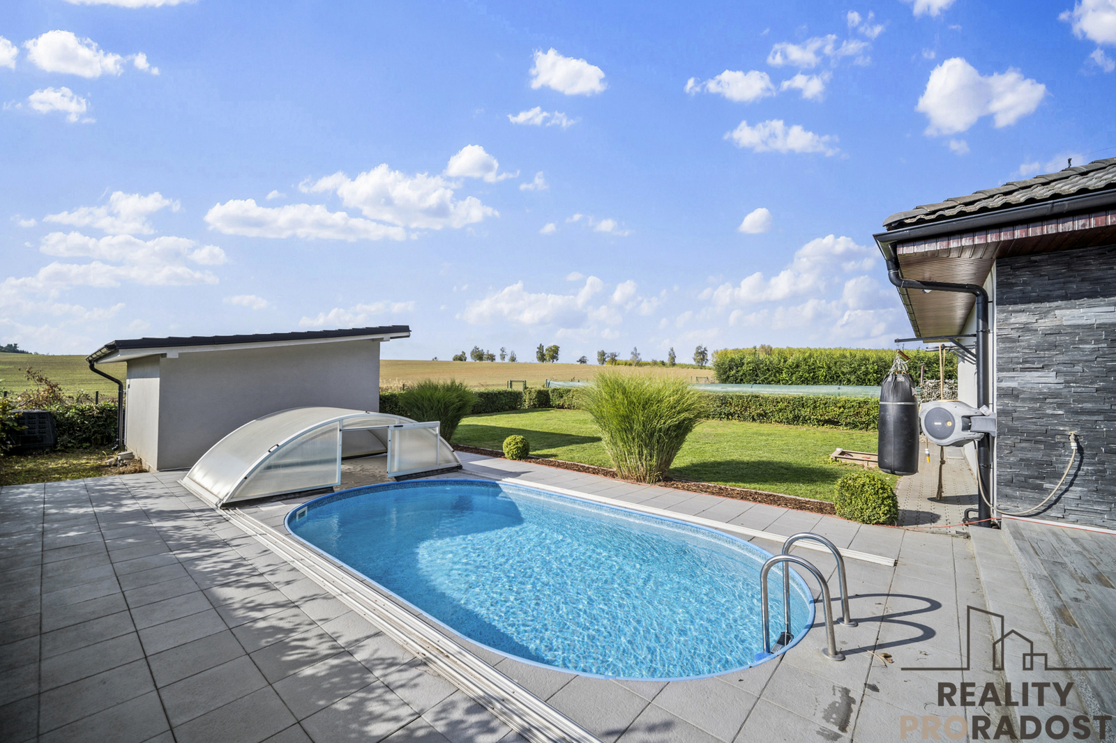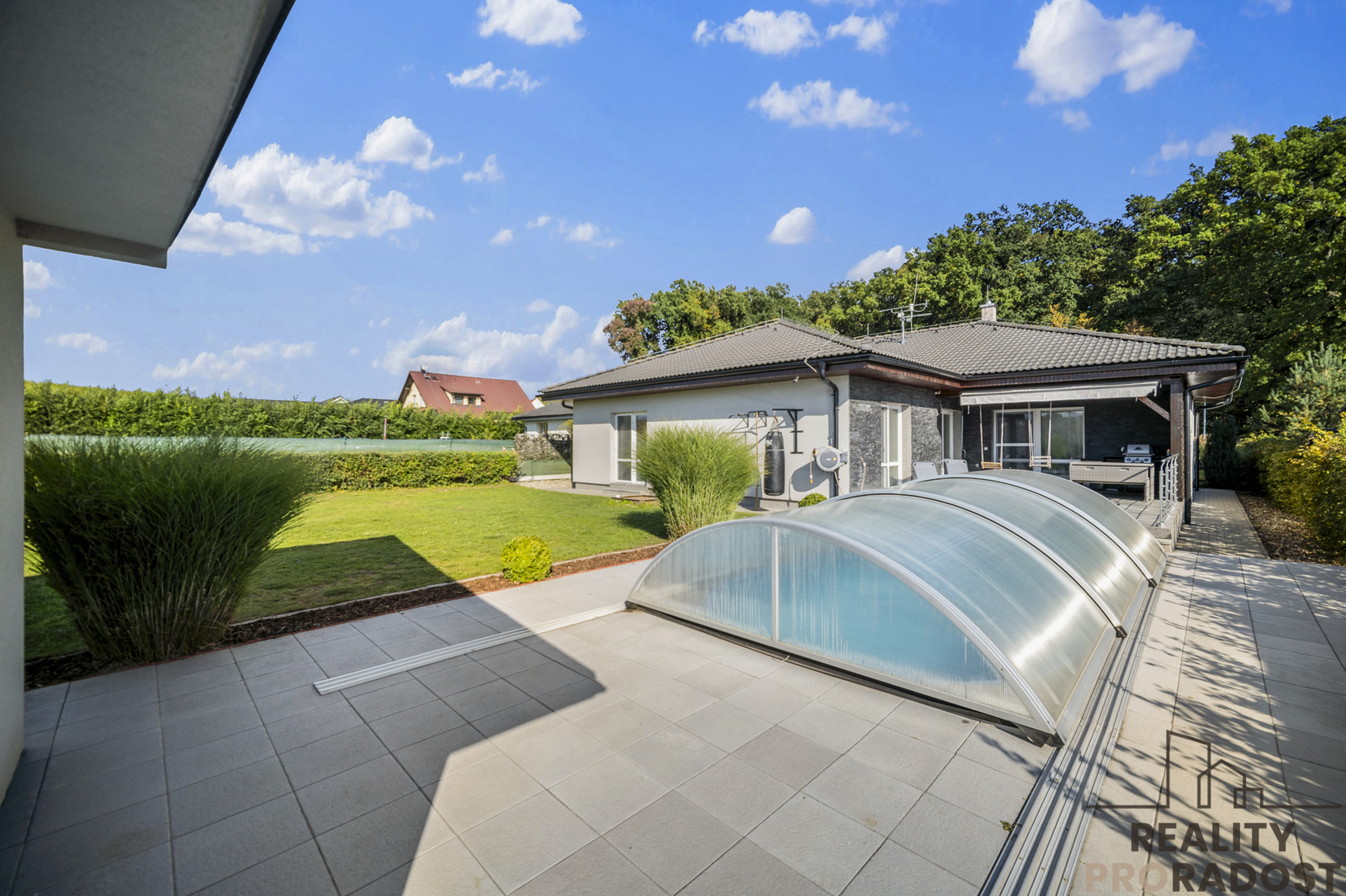 Prodej přízemního rodinného domu 5+1, 200 m2, terasa, bazén, zastřešené stání - Choltice / Chrtníky Hledáte prostorný a kvalitně postavený rodinný dům v klidné lokalitě s výhledem do přírody, a přitom s výbornou dostupností měst? Nabízím k prodeji přízemní bungalov o dispozici 5+1 s obytnou plochou cca 200 m2, nacházející se v obci Choltice - místní část Chrtníky. Dům byl stavěn majitelem stavební firmy, což se odráží v celkovém provedení - důraz na kvalitu materiálů, funkčnost, dlouhou životnost a promyšlené technické řešení. Dispozice domu: Po vstupu do domu se dostanete do předsíně, na kterou navazuje centrální chodba propojující všechny místnosti. Levá část domu nabízí kuchyni propojenou s prostorným obývacím pokojem, který tvoří hlavní obytný prostor domu a místo pro setkávání rodiny. Z obývacího pokoje je přímý vstup na velkou terasu a dále k bazénu. Pravá, klidová část domu zahrnuje pracovnu / kancelář, ložnici, dva dětské pokoje a dvě koupelny - jednu s vanou a druhou se sprchovým koutem. V domě jsou napínané stropy, které zajišťují dokonale rovný povrch, dlouhou životnost, snadnou údržbu a lepší akustiku. Pod nimi je plnohodnotná sádrokartonových strop. Exteriér a zahrada Zahrada je navržena s důrazem na komfort a minimální údržbu - sekání celého pozemku zajišťuje robotická sekačka. Dominantou exteriéru je bazén s protiproudem o rozměrech 7,5 × 4,3 m a hloubce 150 cm. Dlažba kolem bazénu plynule navazuje na terasu u obývacího pokoje. Před domem se nachází parkovací místo a zastřešený přístřešek, díky kterému lze parkovat pod střechou a vstupovat do domu suchou nohou. Vjezdová brána je na dálkové ovládání. Technické informace přízemní bungalov, 5+1, cca 200 m2 konstrukce z Ytongu tl. 52 cm, strop: 40 cm minerální vaty mezi vazníky teplovodní podlahové vytápění napojení na vodovodní řád odpad řešen čističkou s přepadem do dešťové kanalizace datové rozvody v celém domě bezpečnostní kamerový systém Lokalita Jednou z největších předností domu je jeho umístění - za domem se nachází otevřené pole s výhledem na lesy, bez přímé navazující zástavby, což zajišťuje klid a soukromí. Před domem se rozprostírá zámecký park Choltice, ideální pro procházky a relaxaci. Obec Choltice nabízí základní i mateřskou školu, obchody, služby a sportovní vyžití. Výborná je i dostupnost: Přelouč 10-12 min, Heřmanův Městec 15-18 min, Chrudim 20-25 min, Pardubice cca 20 min. Doplňující informace Nemovitost je nabízena k prodeji od února, součástí prezentace jsou však i fotografie pořízené na podzim, aby si zájemci mohli lépe představit, jak krásná a zelená je zdejší příroda a zahrada v období od jara do podzimu. Martin Socha Realitní makléř