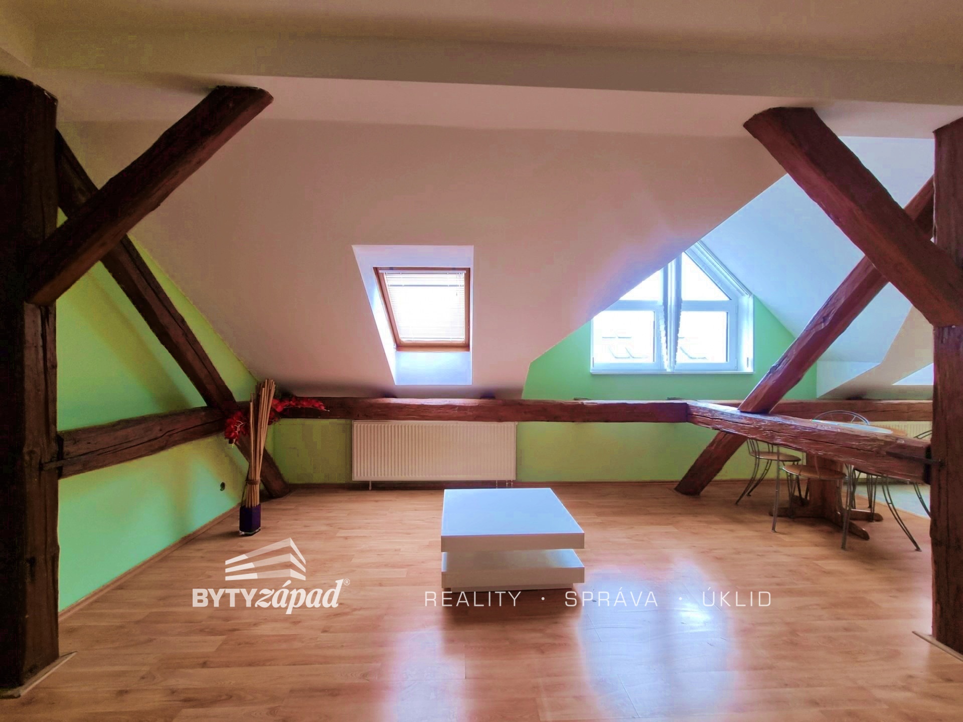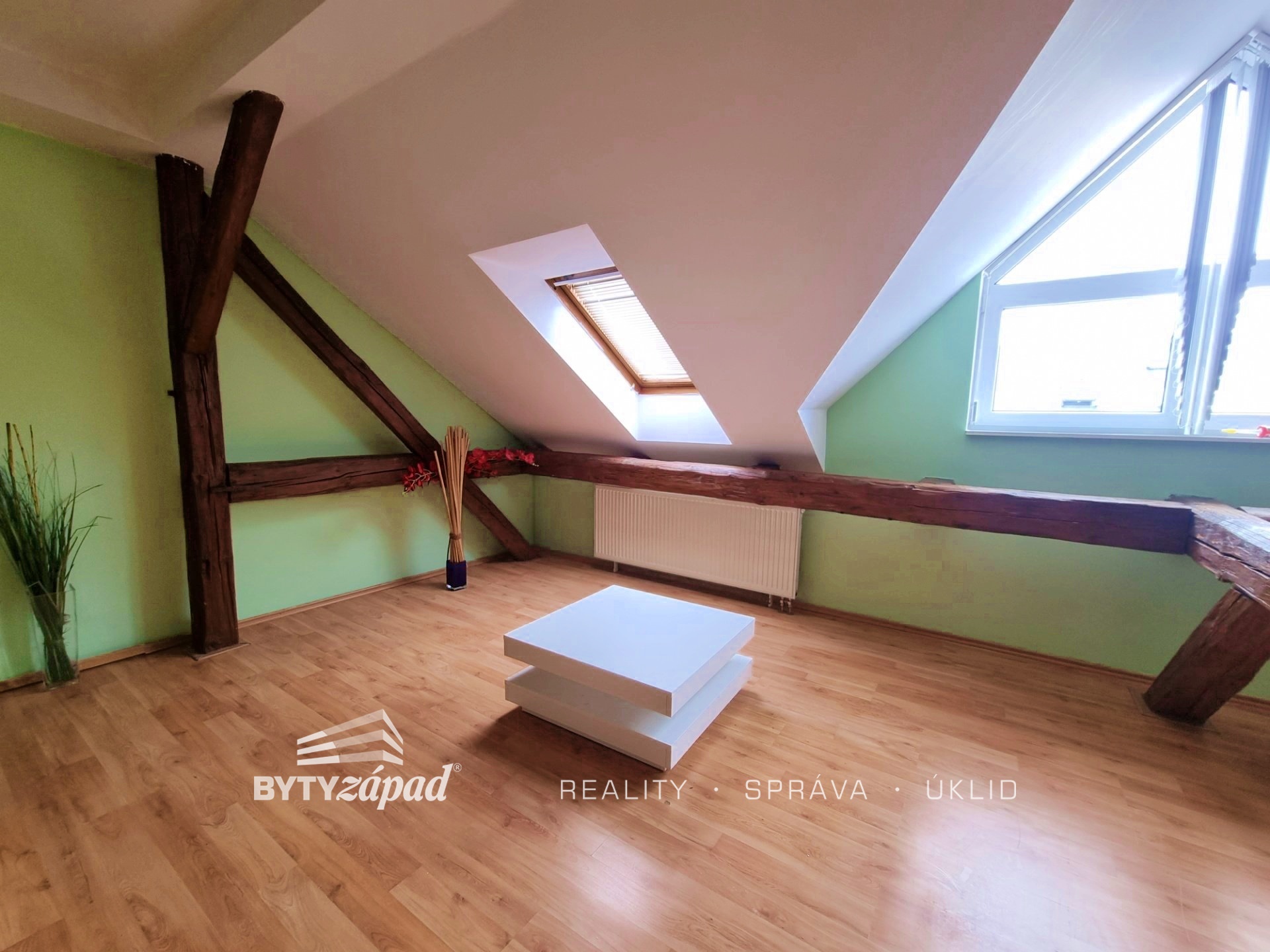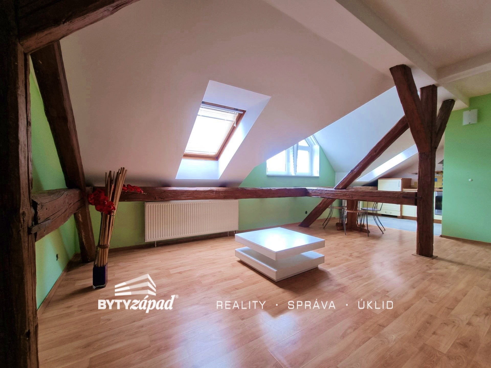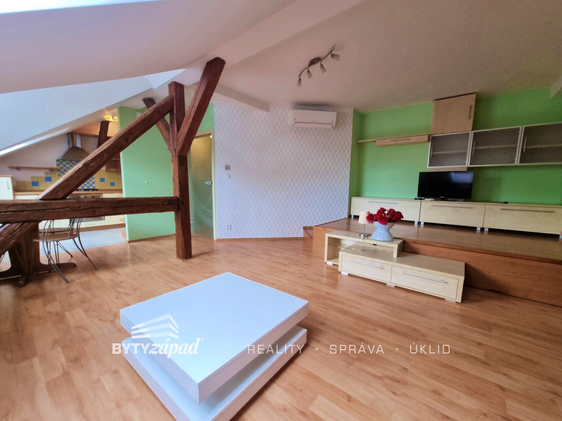 Nabízíme Vám k pronájmu plně vybavený a nadstandardně prostorný podkrovní byt o dispozici 1+kk, nacházející se v centru Plzně, konkrétně v ulici Purkyňova. Bytová jednotka velkorysé výměře 48 m2 je situovaná do 4. patra cihlového bytového domu bez výtahu. Byt se skládá z obývacího pokoje s pódiem, ze kterého se vysunuje dvoulůžkový rošt, kuchyňského koutu s vestavěnými spotřebiči (trouba, sporák, digestoř, lednice), chodby s vestavnou skříní a koupelny, ve které dominuje rohová vana a pračka. K dispozici je nájemcům také klimatizace starající se o příjemné klima v bytě a prostřednictvím bezdrátového termostatu s mobilní aplikací ovládaný plynový kotel. Byt doporučujeme spíše pro jednotlivce, kteří ocení plně vybavený byt v bezprostřední blízkost centra města. K nájemnému budou připočteny zálohy na služby ve výši 750,- Kč na osobu, elektřinu a plyn si nájemce převádí na sebe. Byt bude volný od 1.4.2026. Je vyžadována kauce rovnající se dvěma měsíčním nájmům, nájemné na další měsíc a odměna realitní společnosti. Pro více informací pište realitnímu makléři.