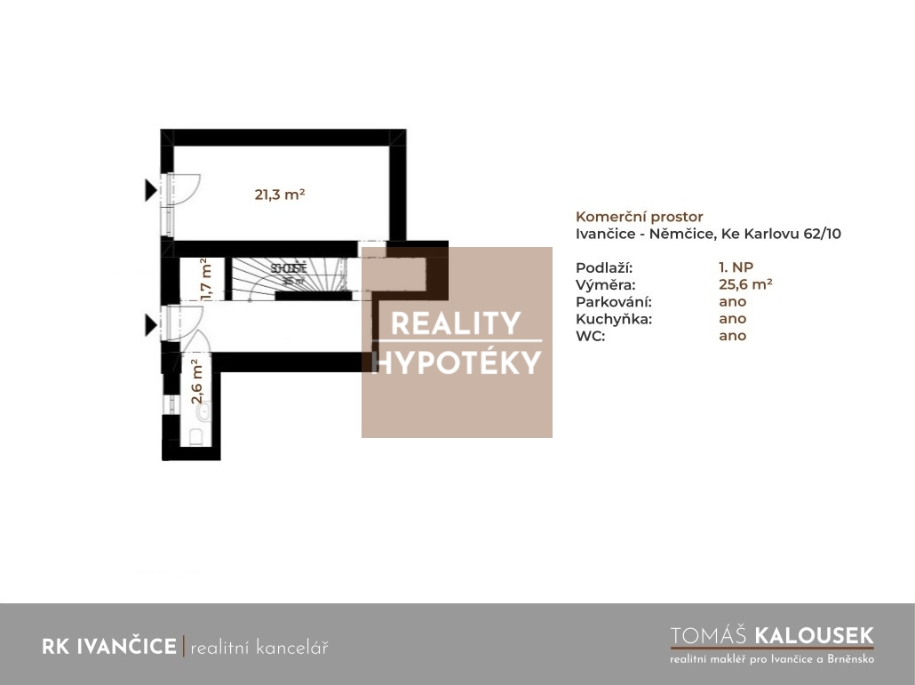 Nabízím pronájem komerčního prostoru (25 m2) v přízemí objektu na ulici Ke Karlovu v Ivančicích. Ideální využití jako kancelář, sklad nebo třeba pro služby (kadeřnictví, kosmetický salón, nehtové studio, účetní / projekční kancelář, konzultační místnost, ateliér atp.). Potřebujete-li více prostoru, lze pronajmou také další prostory v budově (viz další inzerce, případně mi prosím zavolejte). Současné dispoziční řešení viz přiložený půdorys. Prostory lze přizpůsobit vlastním potřebám (rozdělení / přepažení místností,...). Možnost vyhrazeného parkování v oploceném areálu za objektem. K dispozici od 1.března 2026. Součástí: / kuchyňka / WC / nakládací rampa / kamerový + zabezpečovací systém / datové rozvody Vytápění objektu radiátory (plynový kotel). Napojeno na obecní vodovod. Budova je zateplena, nicméně průkaz energetické náročnosti budovy nebyl prozatím dodán, proto je uvedena energetická třída G. Měsíční náklady: Nájemné: 4.000 Kč + DPH Zálohy na služby dle domluvy ohledně využití (elektřina, vytápění, voda) Před zahájením nájmu je hrazena provize 5.000 Kč a jistota 10.000 Kč. Objekt se nachází v Ivančicích, městě s cca 10 tis. obyvateli, do jehož správního obvodu spadá dalších 17 okolních obcí. Jedná se o dobře dostupnou lokalitu, pokrytou Integrovaným dopravním systémem (IDS JMK) kombinující vlakovou a autobusovou dopravu. Napojení na dálnici D1 dosáhnete během pár minut a nejbližší letiště (LKBUDK) je vzdálené pouhé 3 km, mezinárodní letiště Brno pak 35 km. Město těží ze svého strategického umístění v brněnské metropolitní oblasti - cca 25 km od Brna a pouhých 16 minut cesty od Jaderné elektrárny Dukovany, kterou v následujících letech čeká dostavba dalších bloků a měla by tak do kraje přivést další tisíce lidí. Zavolejte mi nebo se zastavte na kávu v kanceláři a rád Vám dodám bližší informace. Tomáš Kalousek - Realitní makléř pro Ivančice a Brněnsko RK IVANČICE | realitní kancelář Palackého nám. 2/5, Ivančice