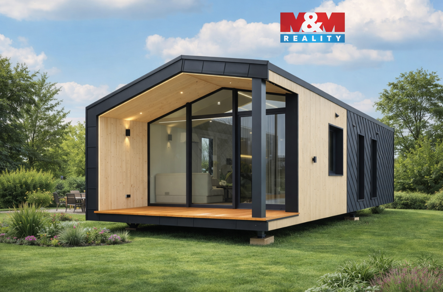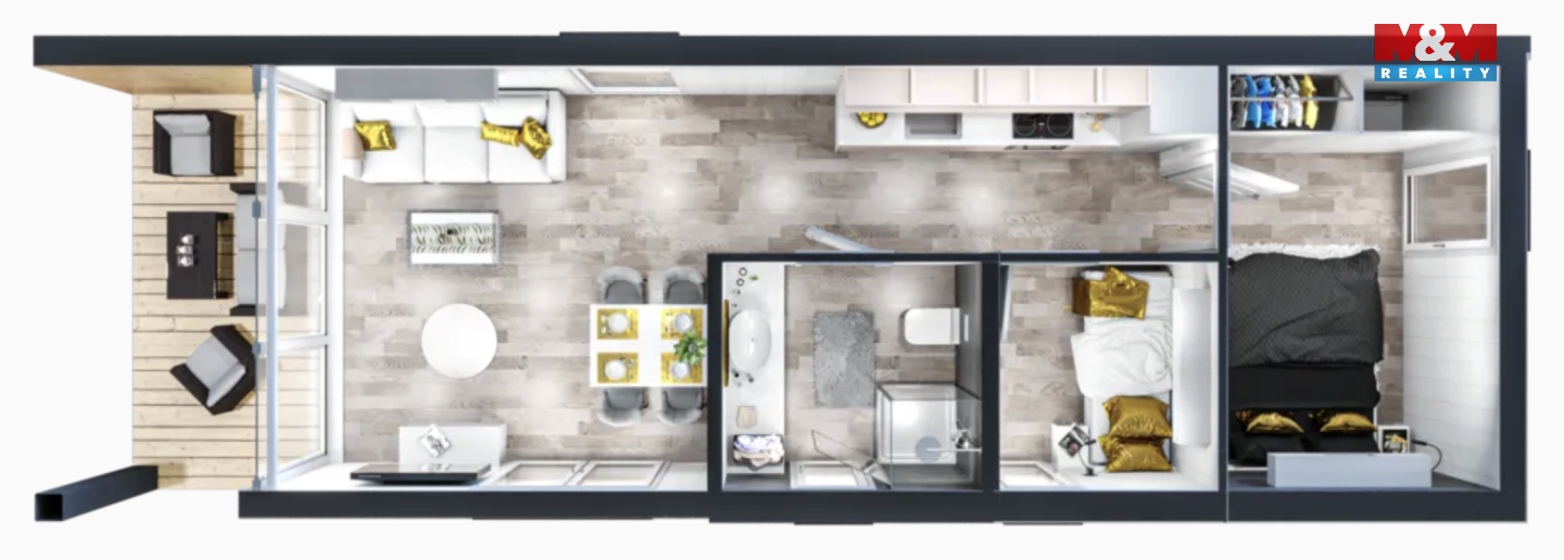 Mobilní dům BLACK STONE představuje moderní řešení pro ty, kteří hledají komfortní bydlení či rekreační zázemí bez kompromisů. Stylový design inspirovaný nejnovějšími trendy vytváří nadčasovou atmosféru. Na ploše 43 m2 nabízí terasu, prostorný obývací pokoj s kuchyňským koutem, útulnou ložnici a moderní koupelnu. Dům je kompletně vybaven nábytkem, kuchyňskými spotřebiči, pračkou i klimatizací - stačí se jen nastěhovat a užívat si pohodlí. S výhodným financováním Vám rádi pomůžeme. Realizace je možná do 6 měsíců od vyřízení stavebního povolení, které též dokážeme zajistit. Prohlídka domu je možná po domluvě s makléřem, který Vás provede celým showroomem v Rychnově nad Kněžnou.