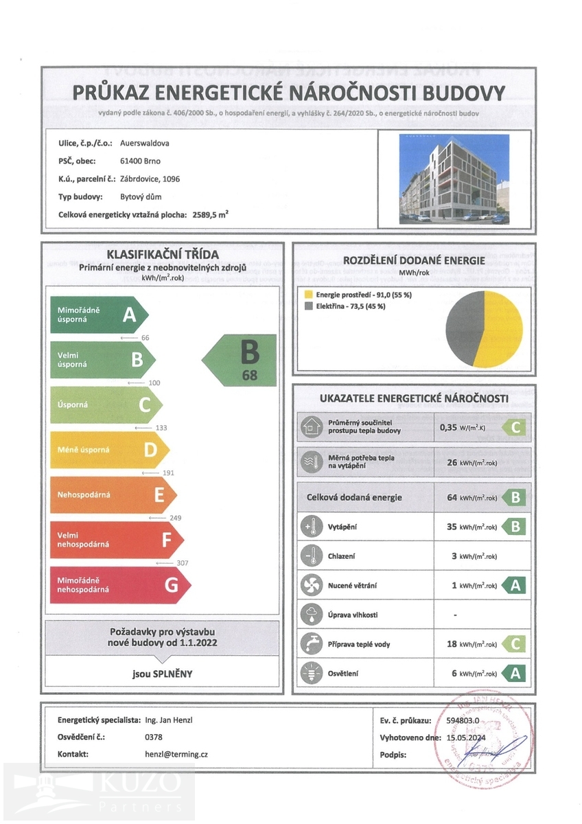Ve výhradním zastoupení majitele nabízíme stylový podnájem 2+kk s balkonem, 60m2, kolárnou a parkovacím stáním - nový byt, nová energie, nový domov v novostavbě na ulici Auerswaldova č.8, v dynamicky se rozvíjející části Brno-Zábrdovice. CP-60m2 UP - 47 m2 + balkon - 13m2 Byt je umístěn v 5. nadzemním podlaží novostavby s výtahem. Výhoda prvního nájemníka - vše nové, nepoužité, připravené pro vás. Slunný prostor s atmosférou moderního městského bydlení. Z ložnice je přímý vstup na balkon orientovaný do klidného vnitrobloku, ve kterém je také prostor k posezení. Koupelna je vybavena vanou, toaletou, umyvadlem se zrcadlovou skříňkou, otopným žebříkem a přípojkou na pračku. Celý prostor je laděn v čistém, moderním designu, který podtrhuje svěžest novostavby. V bytě je podlahové vytápění, elegantní vinylové podlahy, rekuperace v pobytových místnostech a velkoformátová okna s trojskly. Nízké provozní náklady zajišťuje PENB třídy B. Možností podnájmu je garážové stání přímo v domě, viz. foto. Cena: 2.500,- Kč/měsíc. Rozpis výše záloh/ 2osoby. Vodné a stočné, odvod odpadních vod 750,- Kč/ měsíc Teplo 1.300,- Kč/měsíc Ohřev TUV 1.200,- Kč/měsíc Elektrická energie (spol. prostory) 64,- Kč/měsíc Úklid společných prostor 268,- Kč/měsíc Provoz výtahu 82,- Kč/ měsíc Záloha na elektřinu ve výši 1.000,-Kč měsíčně + internet Celkem: 4.664,-Kč/2osoby c) internetové připojení - v bytové jednotce jsou internetové rozvody (kabeláž + zásuvky), jejich připojení k příslušnému provideru internetu si zajistí a hradí nájemce. Bytový dům se nachází v části Zábrdovice s výbornou dostupností do centra města. V okolí je veškerá občanská vybavenost - zastávky MHD, obchody, kavárny, fitness centrum. Ideální místo pro páry hledající moderní a komfortní dlouhodobé bydlení blízko centra Brna. Dopravní dostupnost je skvělá, s rychlým napojením na městský okruh a do všech částí města. Prohlídka je možná po domluvě s uvedeným makléřem.