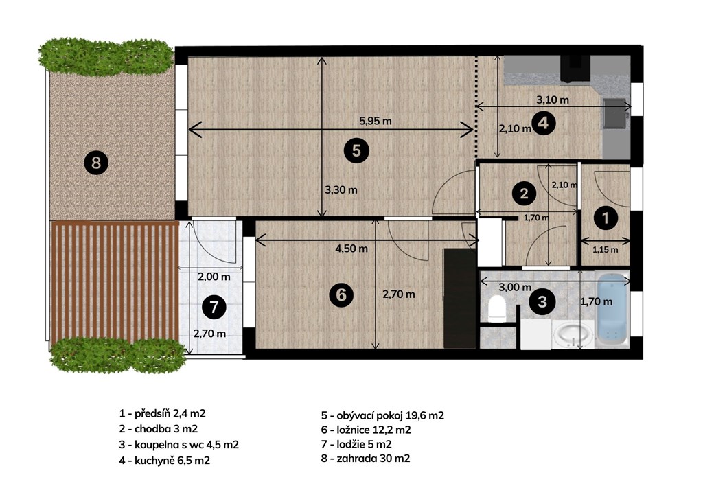 Nabízíme k prodeji útulný byt 2+KK se soukromou zahradou, který se nachází na ulici Sokolnická v Brně v Tuřanech. Bytová jednotka o užitné ploše 48,2 m2 je umístěn v 1. nadzemním podlaží zděného domu s pavlačí. Díky orientaci na jihozápad a do klidného vnitrobloku nabízí příjemné a ničím nerušené bydlení. Dispozice bytu je praktická a promyšlená. Tvoří ji vstupní předsíň (2,4 m2) s navazující chodbou (3 m2), koupelna s toaletou (4,5 m2), prostorný obývací pokoj (19,6 m2) s kuchyňským koutem (6,5 m2) a ložnice (12,2 m2) vybavená skříní. Velkou výhodou jsou okna v kuchyni i koupelně, která zajišťují přirozené denní světlo a možnost přirozeného větrání. Součástí bytu je také lodžie o velikosti 5 m2, která přímo navazuje na soukromou zahradu o ploše 30 m2 s pergolou a přívodem vody, což je ideální pro péči o zeleň, letní posezení či další venkovní aktivity. K bytu náleží také sklep o velikosti 1,7 m2. Byt je ve velmi dobrém technickém stavu. Elektroinstalace je v mědi, rozvody vody v plastu, okna jsou dřevěná s izolačním dvojsklem. V roce 2020 byla položena vinylová podlaha a zrekonstruována kuchyň, v roce 2021 byly vyměněny interiérové dveře a v roce 2023 byl instalován nový plynový kotel značky Viessmann, který zajišťuje vytápění i ohřev vody. Celkové měsíční náklady pro dvě osoby činí cca 4.800 Kč. Městská část Tuřany patří mezi oblíbené a plně funkční lokality Brna. Nabízí výbornou dopravní dostupnost - rychlé napojení na dálnice D1 a D2, snadný přístup na městský okruh a pohodlné spojení MHD do centra města, na Campus Square i do FN Brno. Zastávka MHD se nachází jen pár kroků od domu. Parkování je bezproblémové přímo před domem i v jeho okolí, bez modrých zón. Velkou výhodou je také blízkost nákupních a zábavních center Olympia, Avion Shopping Park a OC Kastaňová, která jsou dostupná během několika minut jízdy autem. Tuřany disponují kompletní občanskou vybaveností - mateřskou i základní školou, lékaři, veterinou, poštou, bankomatem, obchody i dalšími službami pro každodenní život. Přímo za domem se nachází dětské hřiště a v okolí je dostatek zeleně a možností k rekreaci. Nechybí cyklostezky vedoucí směrem na Újezd u Brna nebo do přírody podél řeky Dunávky. Tuřany jsou známé svou komunitní atmosférou, pravidelnými trhy, místními akcemi a dobrou dostupností sportovišť. V případě zájmu o prohlídku nás neváhejte kontaktovat. Rádi vám byt osobně představíme.