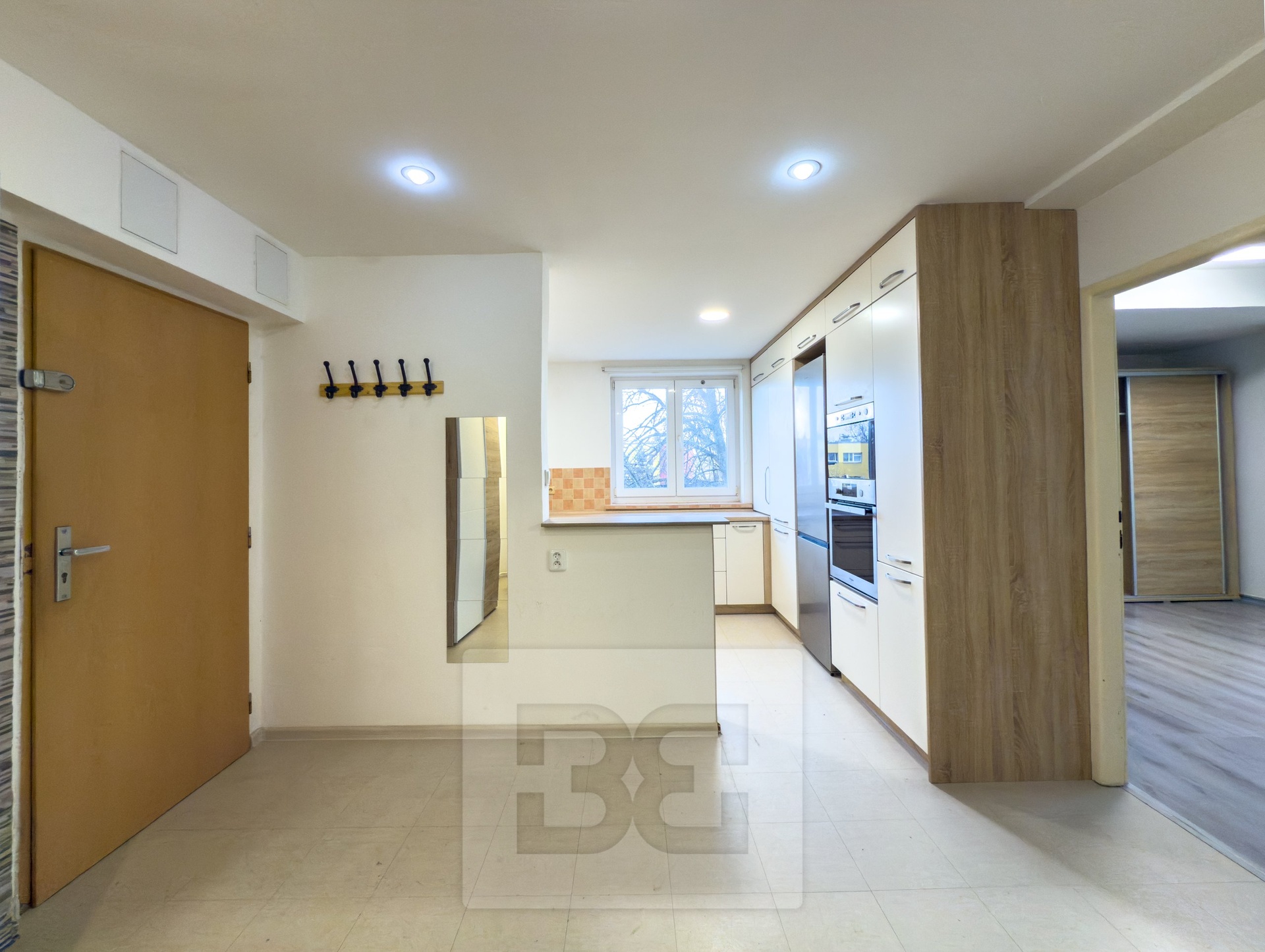 Byt je vybaven moderní prostornou kuchyňskou linkou se spotřebiči (lednice s mrazákem, indukční deska, trouba, digestoř, myčka). Dále v předsíni najdeme šatní skříň. V ložnici se nachází další skříň. Druhý pokoj je nevybavený. Koupelna je vybavena sprchovým koutem, toaletou a pračkou.